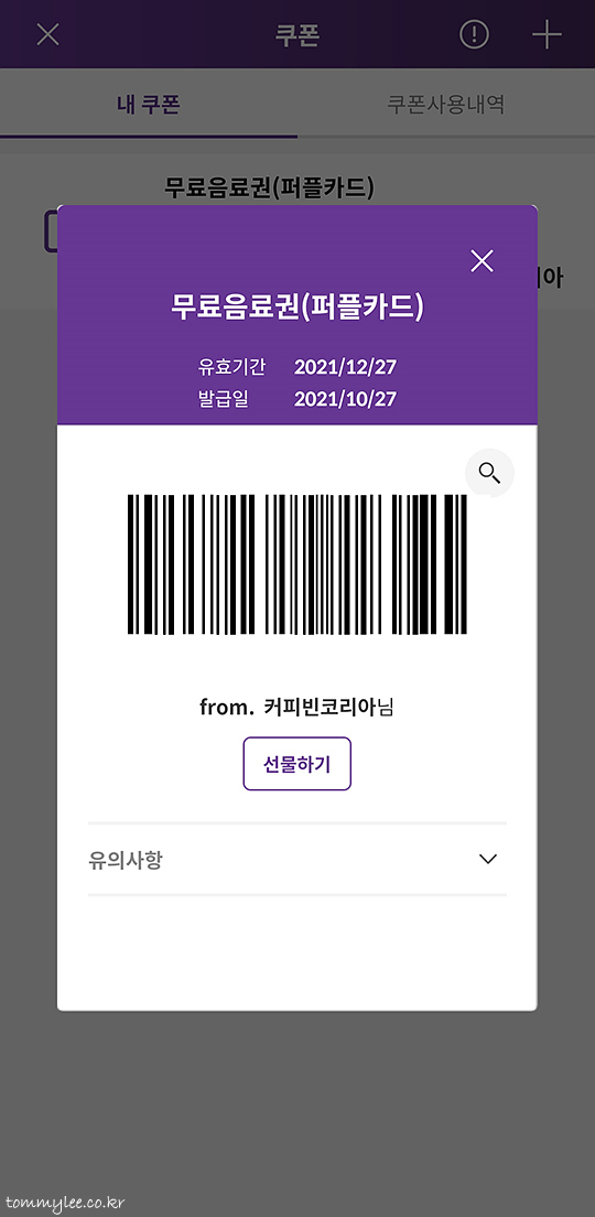 커피빈은 퍼플카드라는 스탬프카드가 있어서 음료 12잔을 마시면 무료음료권을 받을 수 있는데요.. 커피빈 무료음료권의 특징은 다른 커피전문점들과는 달리 기본인 S사이즈로만 받을 수 있는 게 아니라 사이즈 선택이 가능하다는 거.. 그래서 L사이즈 가능 음료를 주문하는 게 유리하답니다..