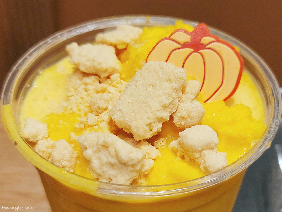 푸짐하게 올려진 소보로 크럼블에 깜찍스러운 호박 초콜릿 굿굿.. 시즌한정 메뉴인데 아직 단호박 파우더가 남아 있는지 판매하고 있네요.. 그나저나 소보로 크럼블 맛있다.. 리필받고 싶다고 막.. ㅋㅋㅋ..
