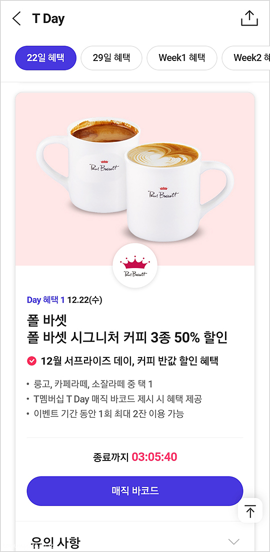 SK텔레콤 T멤버십 T데이 12월 셋째 주 참여 브랜드는 뚜레쥬르, 공차, 배스킨라빈스 그리고 폴바셋.. 폴바셋은 유플러스랑 제휴하고 있는데 T데이에 떡하니 들어와서 깜짝 놀라였답니다.. 이럴 땐 가줘야 한다면서 막.. ㅡㅡ;;..