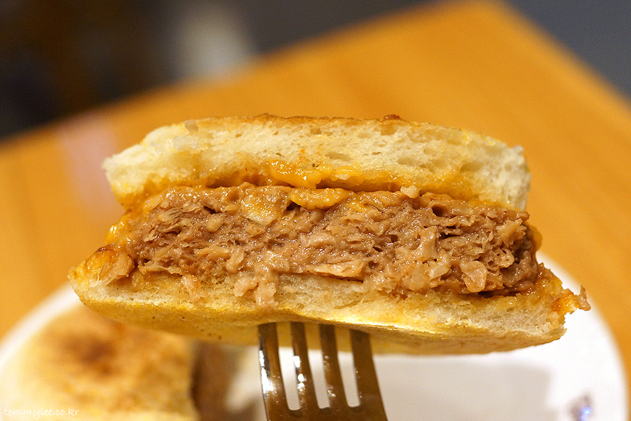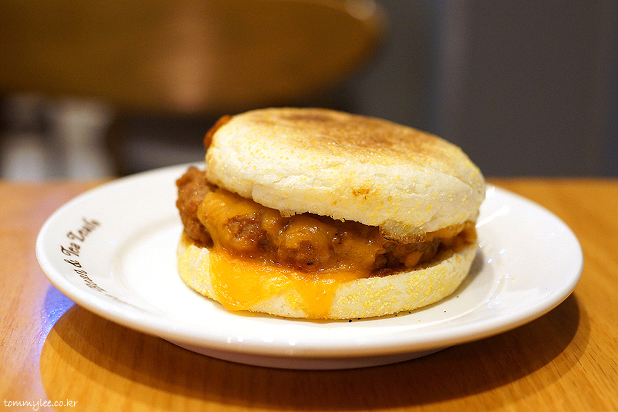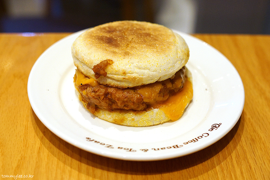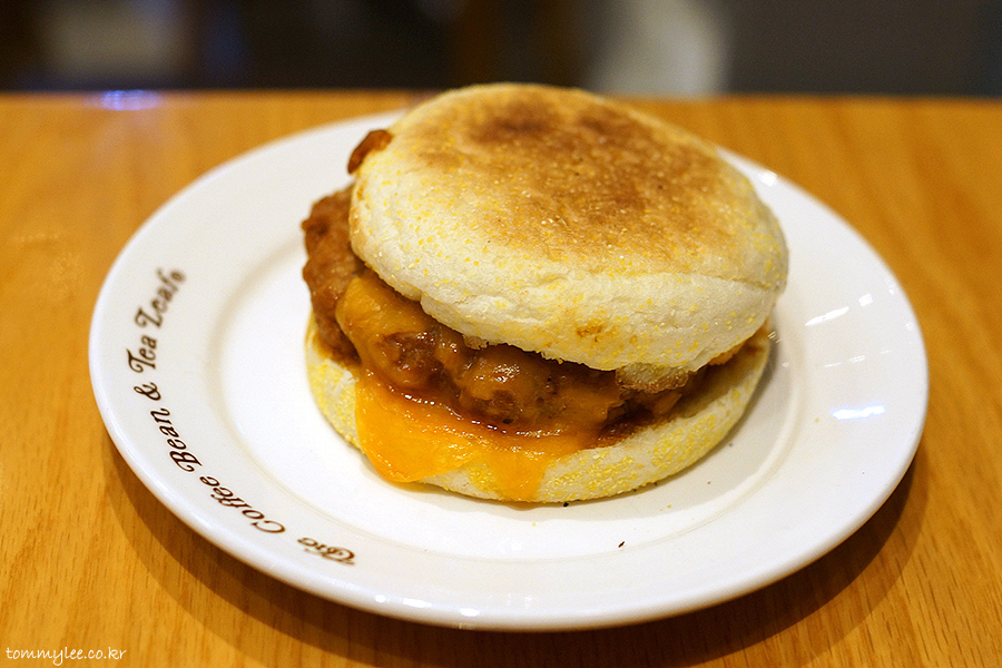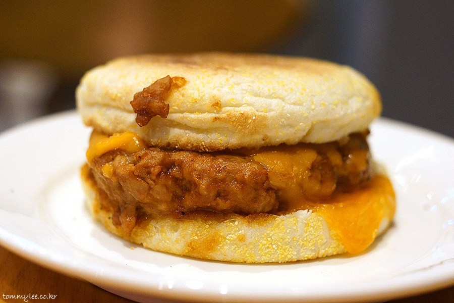 기존 햄치즈 잉글리쉬머핀과는 비교불가의 볼륨이네요.. 플랜트 스테이크 패티가 생각보다 많이 두툼하고 치즈도 제대로 들어가 있습니다.. 당연하지만 치즈도 물론 이미테이션 치즈..