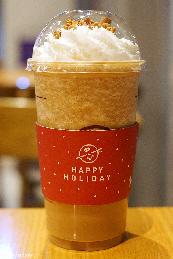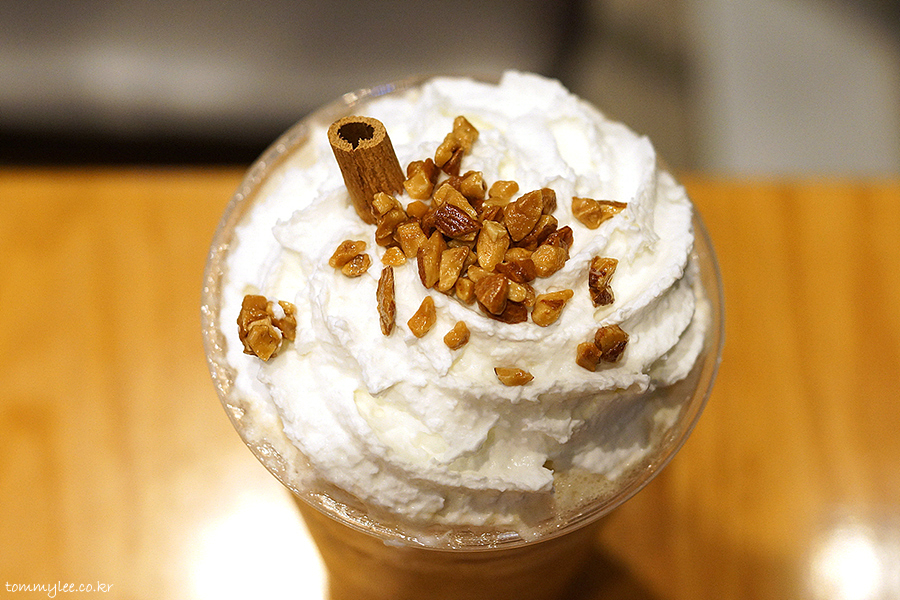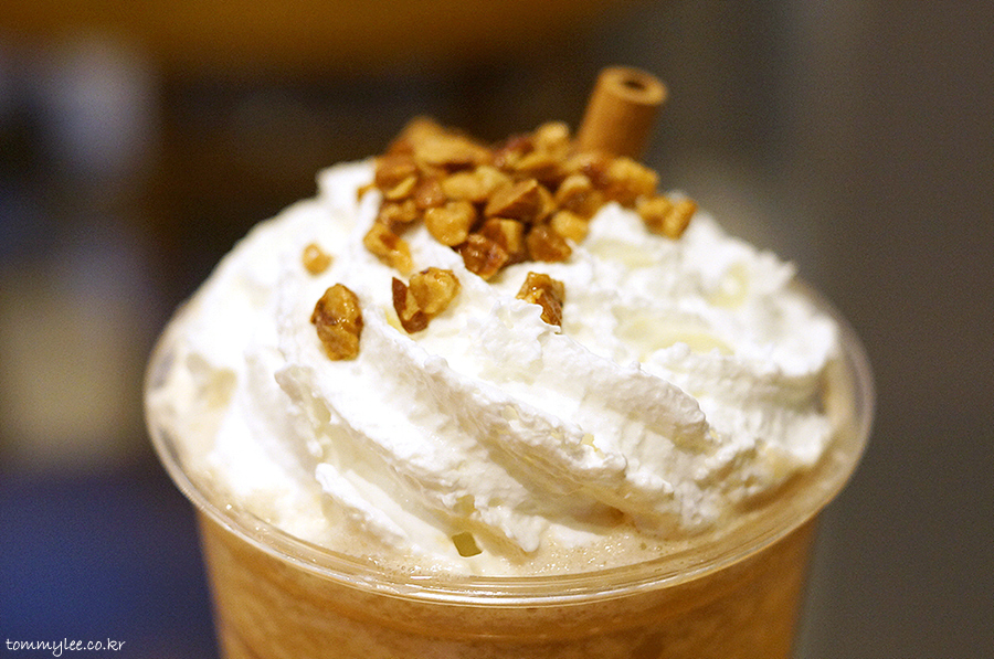 위에서 바라보면 이런 느낌.. 휘핑크림 듬뿍에 아몬드정과와 시나몬 스틱으로 장식.. 메이플 시나몬 라떼 때는 아몬드 토핑이 우유거품에 가려서 안보였는데 블렌디드로 하니까 토핑이 먹음직스럽게 올라가서 더 좋네요..