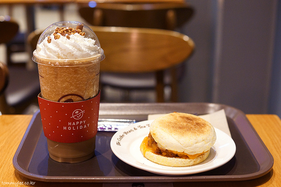 오늘의 늦은 저녁식사 커피빈 잉글리쉬머핀 샌드위치와 아이스 블렌디드..