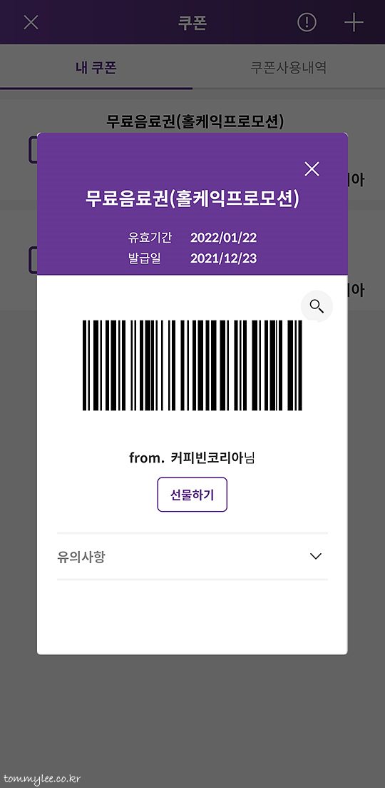 홀케익 프로모션 무료음료권 살랑살랑 흔들며 가벼운 마음으로 커피빈행..