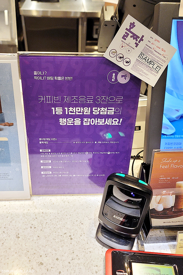 커피빈 제조음료 3잔으로 1등 1천만원 당첨금의 행운을 잡아보세요.. 콩다방게임 시즌2.. 홀이냐? 짝이냐? 배팅 확률은 반반.. 지난 콩다방게임 시즌1 반응이 정말 뜨거웠기 때문에 커피빈에서 연말 선물로 콩다방게임 시즌2를 준비한듯 싶네요.. 12월31일까지 음료 3잔만 마시면 누구나 콩다방게임 참여가능..