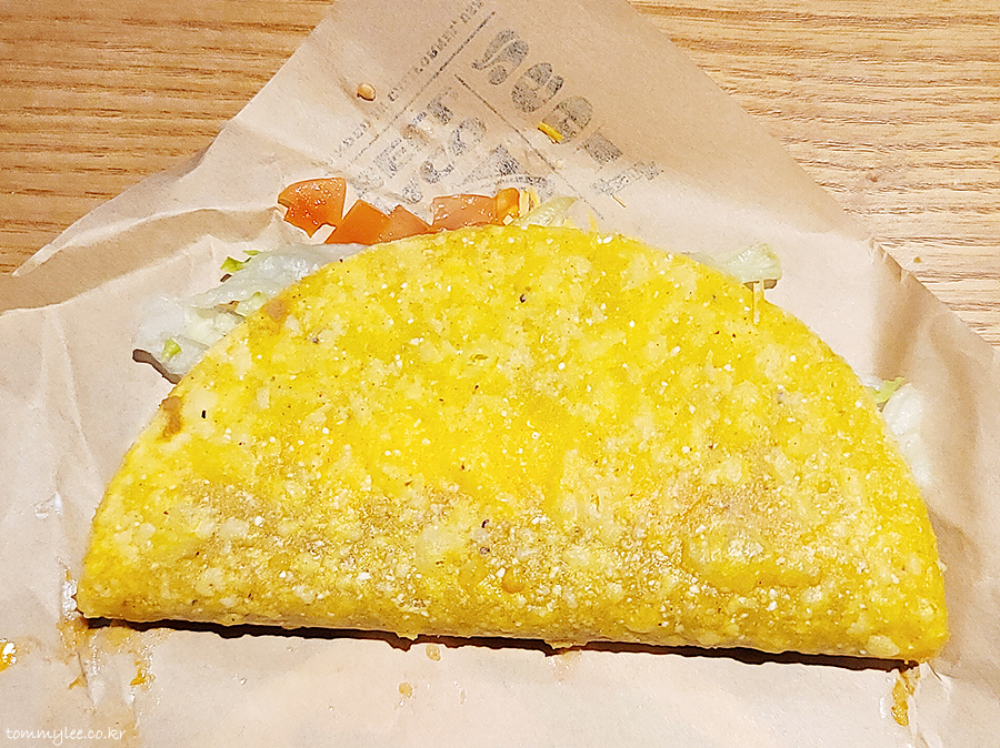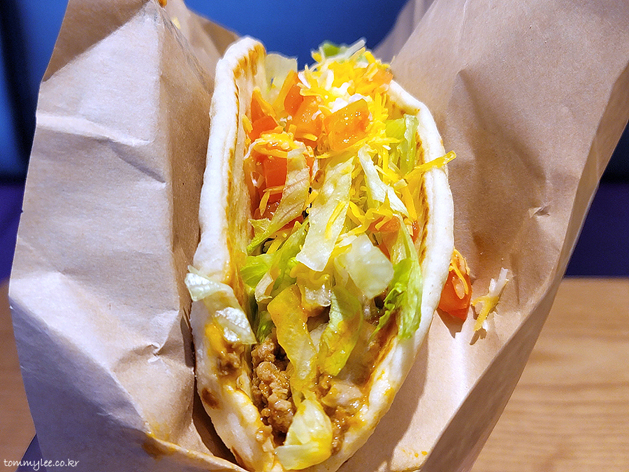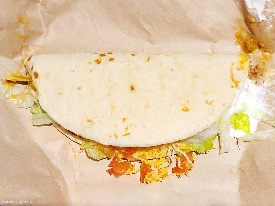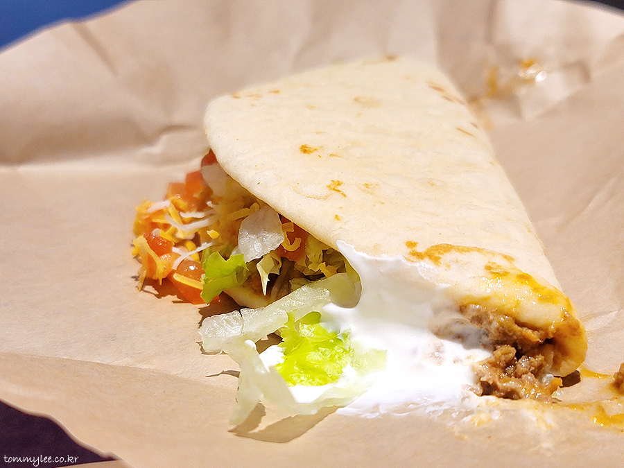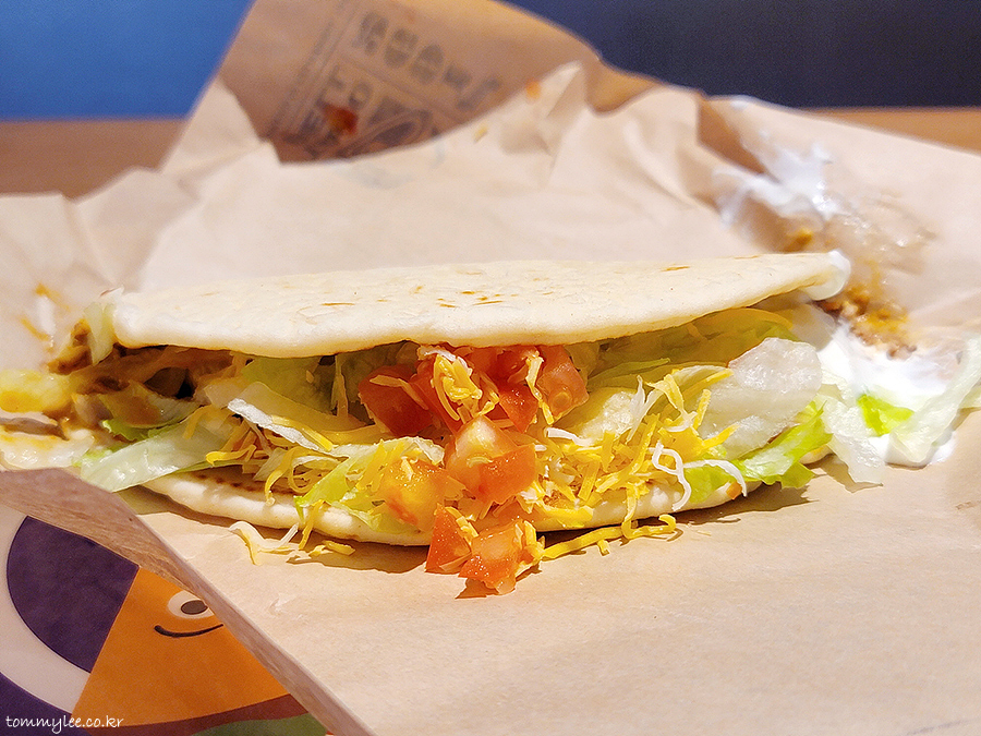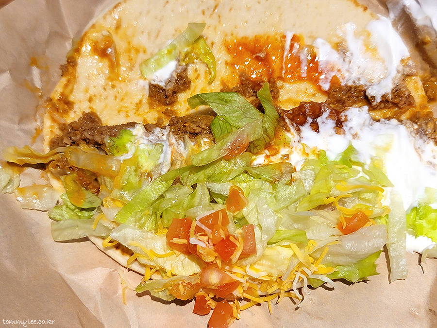 소프트 브레드 타코 안에는 타코밋에 양상추, 토마토, 사우어크림, 살사 그리고 치즈.. 타코벨 코리아는 치즈가 심하게 부실한게 가장 큰 차별 포인트가 아닐까 합니다.. 치즈가 진짜 얇아요.. ㅋㅋㅋ..