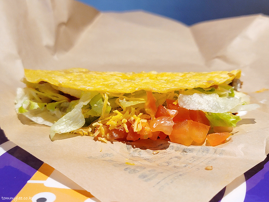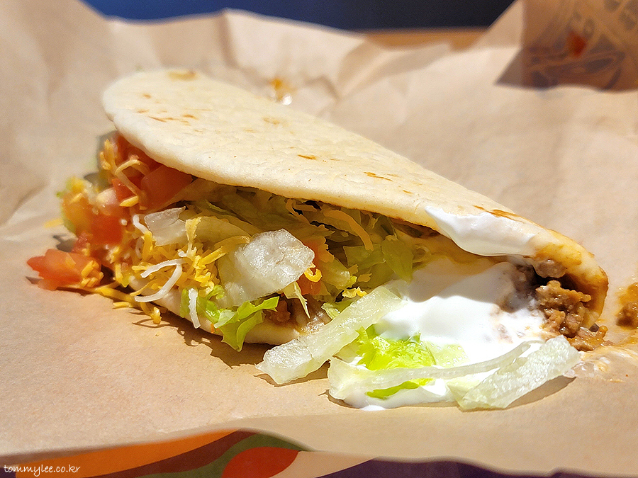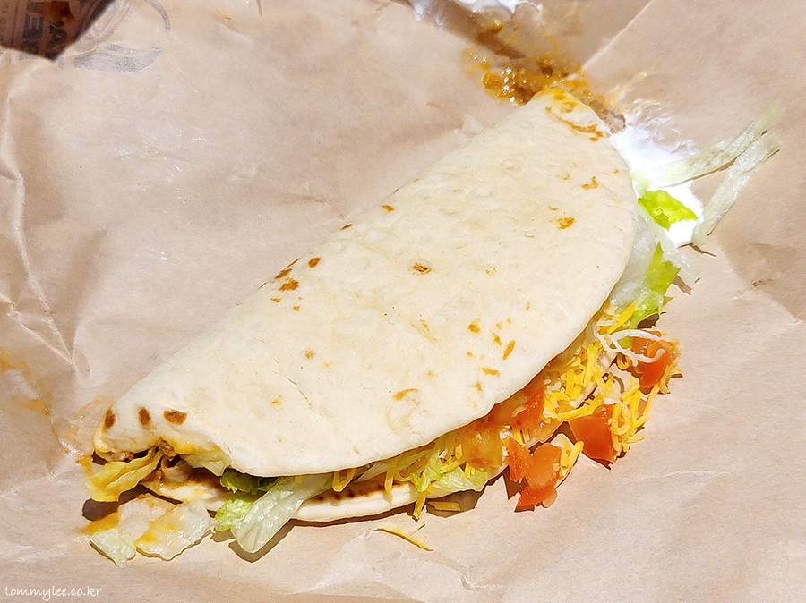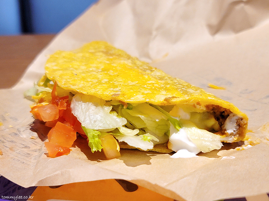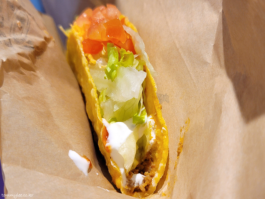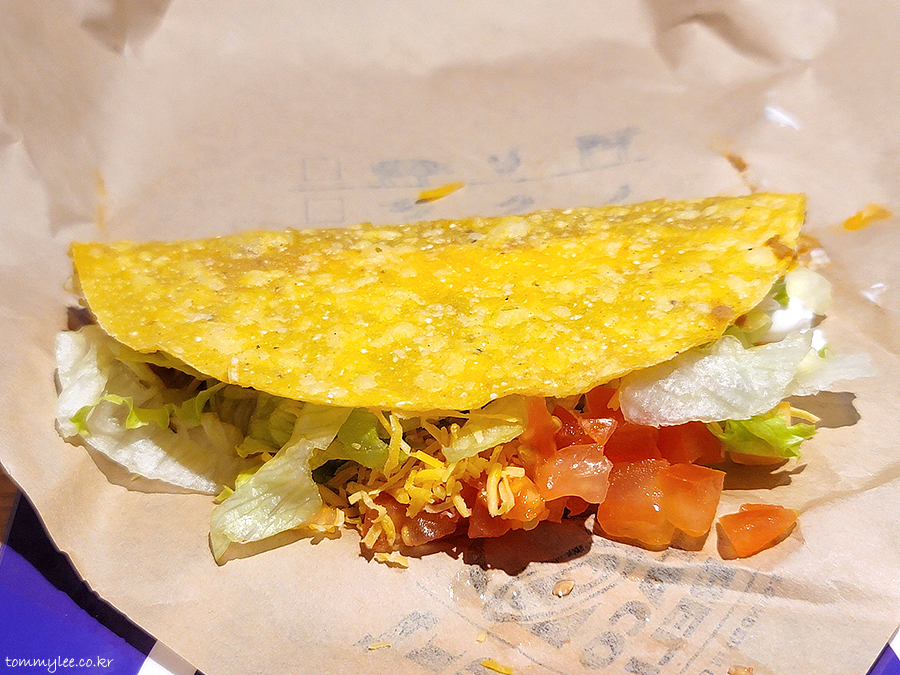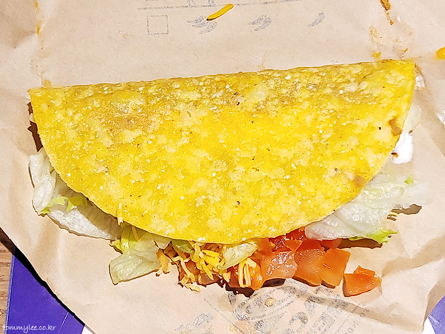 소프트 브레드 타코 안에는 타코밋에 양상추, 토마토, 사우어크림, 살사 그리고 치즈.. 타코벨 코리아는 치즈가 심하게 부실한게 가장 큰 차별 포인트가 아닐까 합니다.. 치즈가 진짜 얇아요.. ㅋㅋㅋ..