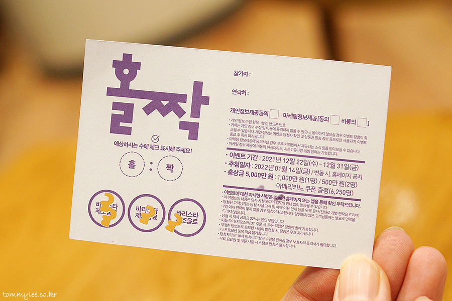 홀이냐 짝이냐 고민을 하다가 전 홀에 걸었습니다.. 콩다방게임 응모자 끝자리 숫자가 홀수면 최소 아메리카노 당첨 짝수면 뭐 아무것도 없는.. ㅡㅡㅋ..