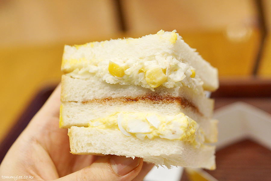 빵-포테이토샐러드-빵-딸기잼-빵-에그샐러드-빵의 순서.. 식빵이 4장 들어가는 샌드위치라 볼륨감은 다른 비싼 샌드위치보다 더 높답니다.. 별 거 안 들어간 저렴이 샌드위치지만 배는 부름.. ㅡㅡㅋ..