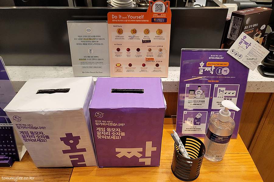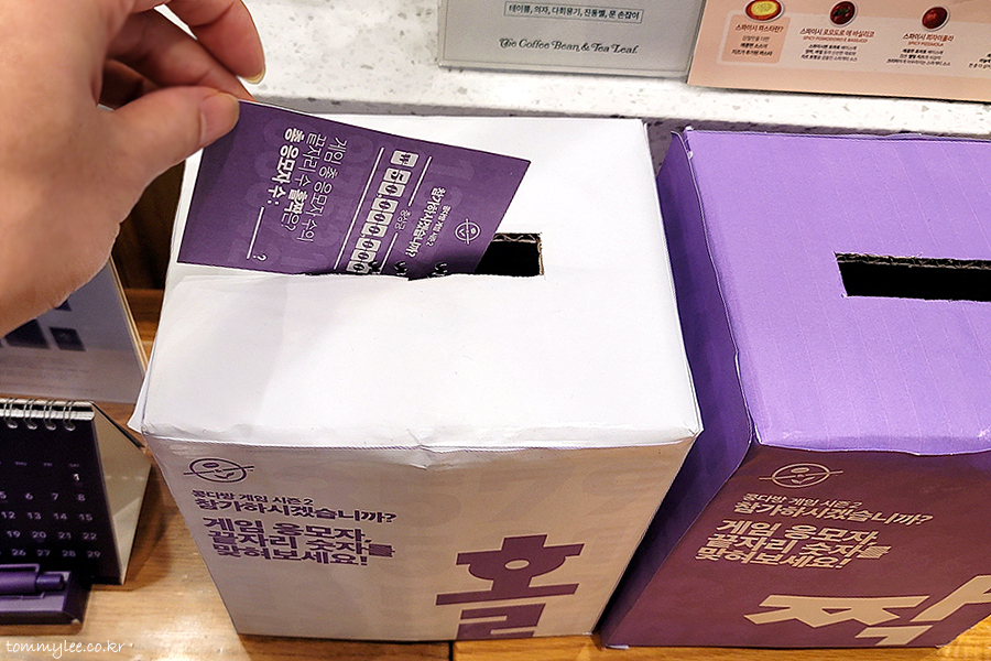 홀짝게임이라면 확률이 반반이잖아요.. 그래서 게임운이 정말 없는 저라도 희망이 있다는 생각에 이 콩다방게임에 진심으로 임했답니다.. 암튼 콩다방게임 시즌2 마지막 날에 응모를 위해 어쩔 수 없이 커피빈 방문.. ㅋㅋㅋ..