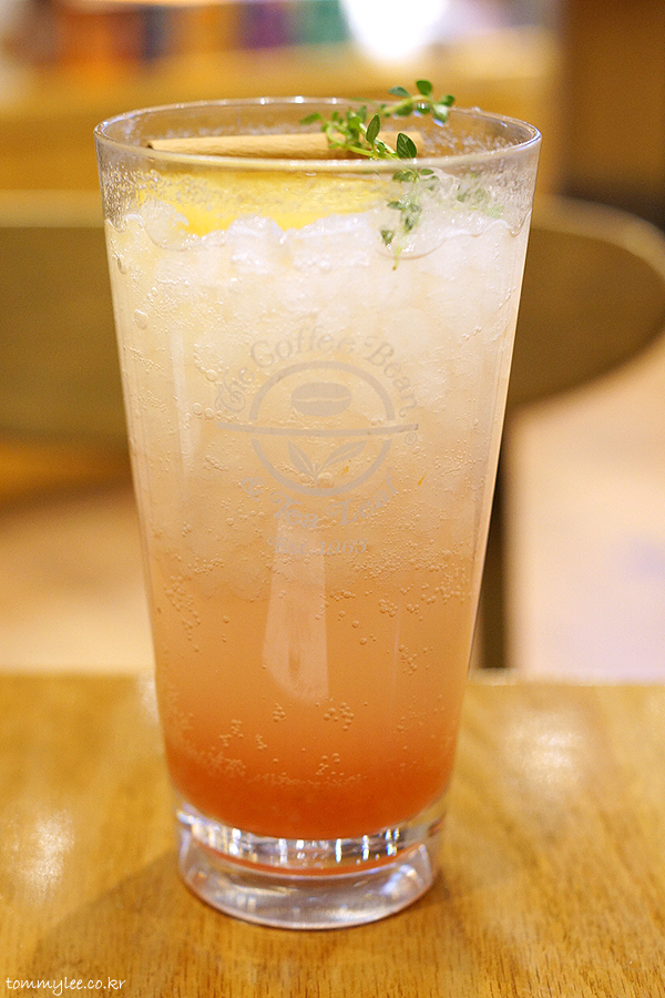 위에서 바라보면 이런 느낌.. 제주산 레몬을 사용해 만든 제주레몬로제뱅쇼의 아이스 버전.. 스파클링워터를 넣어서 청량감을 강조한 게 특징..