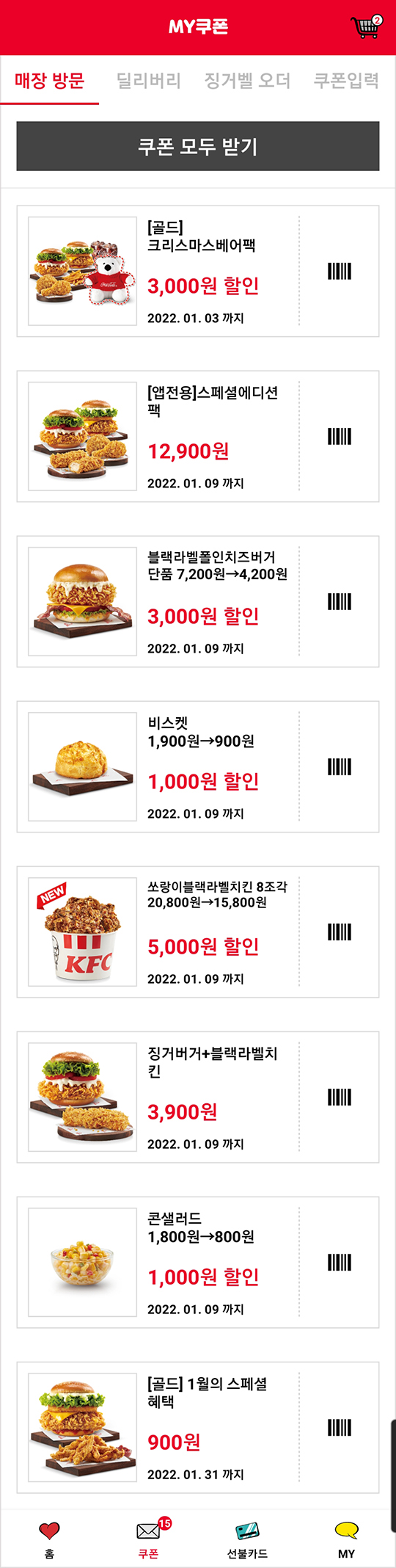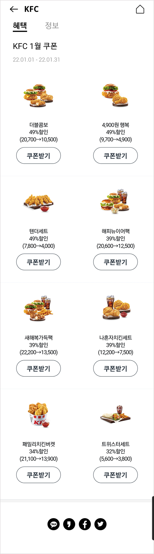 KFC 1월 쿠폰은 위와 같습니다.. 앱쿠폰 외에도 카카오톡 플러스친구 세트 할인쿠폰도 있네요..
