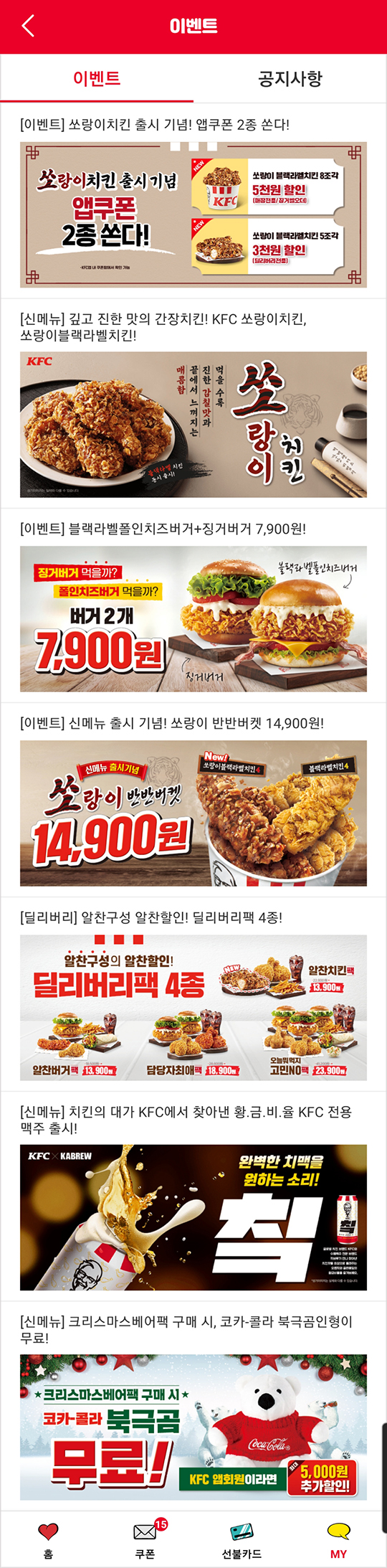 KFC는 신메뉴 쏘랑이 블랙라벨치킨 프로모션이 있고.. 버거2개 7,900원 등의 행사가 있네요..