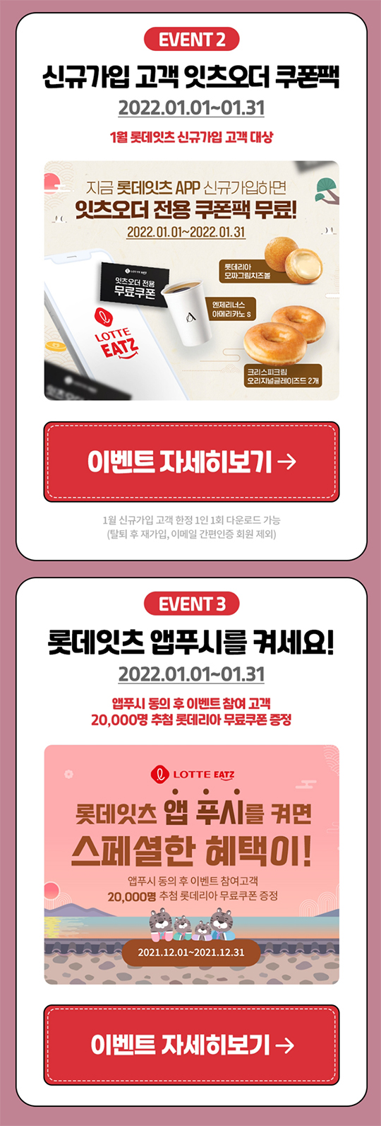 1월 롯데잇츠 신규가입 이벤트로 모짜크림치즈볼 무료, 앱푸시 동의고객 아메리카노 무료 혜택..