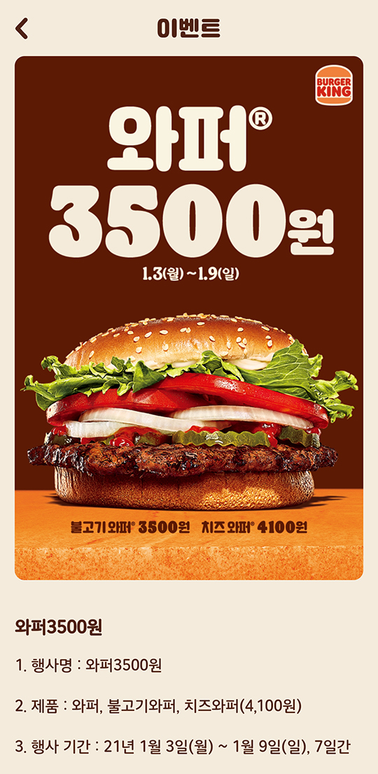 버거킹은 2022년 새해에 와퍼 3,500원 행사를 준비했고요..