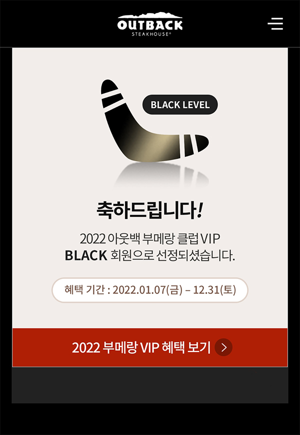 2022 아웃백 부메랑 클럽 VIP에 선정된 회원은 아웃백 앱 실행 시에 이렇게 생긴 팝업이 뜹니다.. 작년과 디자인 완전히 같습니다.. 성의가 없음.. ㅡㅡ;;.. 혜택기간은 2022년 1월 7일(금)~12월 31(토)라고 나오네요.. 부메랑 VIP 기준은 2021년과 같습니다.. 방문 횟수나 결제 금액 기준 변동은 없어요..