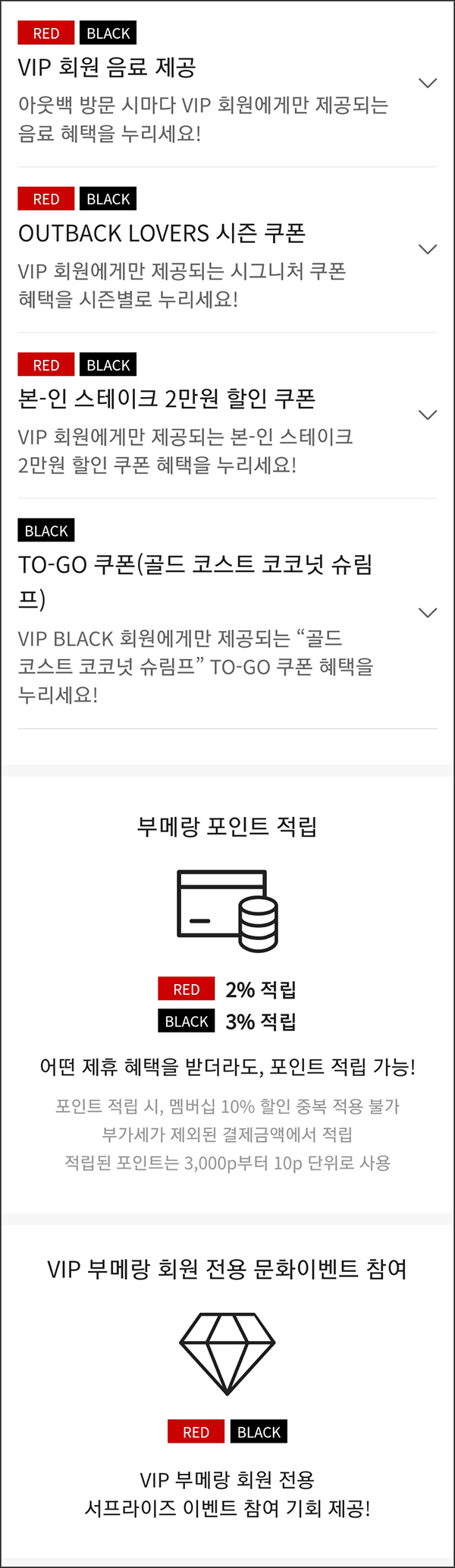 레드와 블랙의 차이점은 포인트를 1% 더 주고, 시즌 쿠폰 +1회, 무알콜 모히토 주는 거랑 골드코스트 쿠폰 주는 게 다릅니다.. 자세한 부메랑 멤버십 프로그램 내용은 → 요기로..