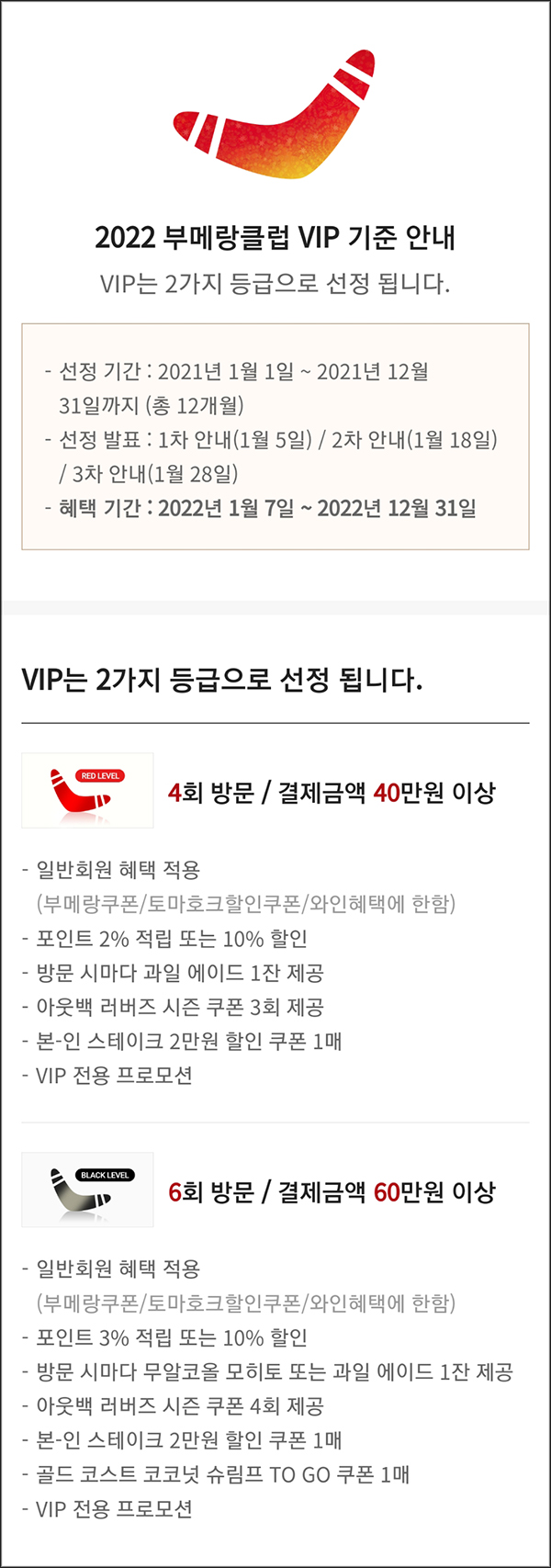 2022 부메랑클럽 VIP는 2가지 등급으로 선정됩니다.. 레드 4회 방문 40만원 이상 / 블랙 6회 방문 60만원 이상으로 지난 해와 같고.. 선정 발표는 1차 1월5일 / 2차 1월18일 / 3차 1월28일로 안내된다고 합니다.. 저는 1차인 듯??..