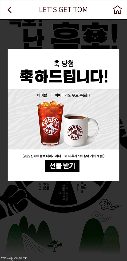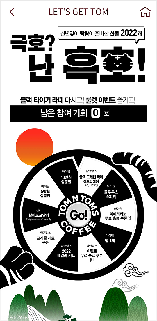 마이탐 스마트오더 또는 선불카드를 통해 제조음료 1종 이상 구매 시 룰렛 참여 가능이고, 블랙타이거 라테를 마시면 룰렛 기회 한번 더~라는 내용입니다.. 꽝이 탐 1개인데 전 운이 좋았네요.. 꼴등 아니면 전 그냥 기분 좋음.. ㅋㅋㅋ..