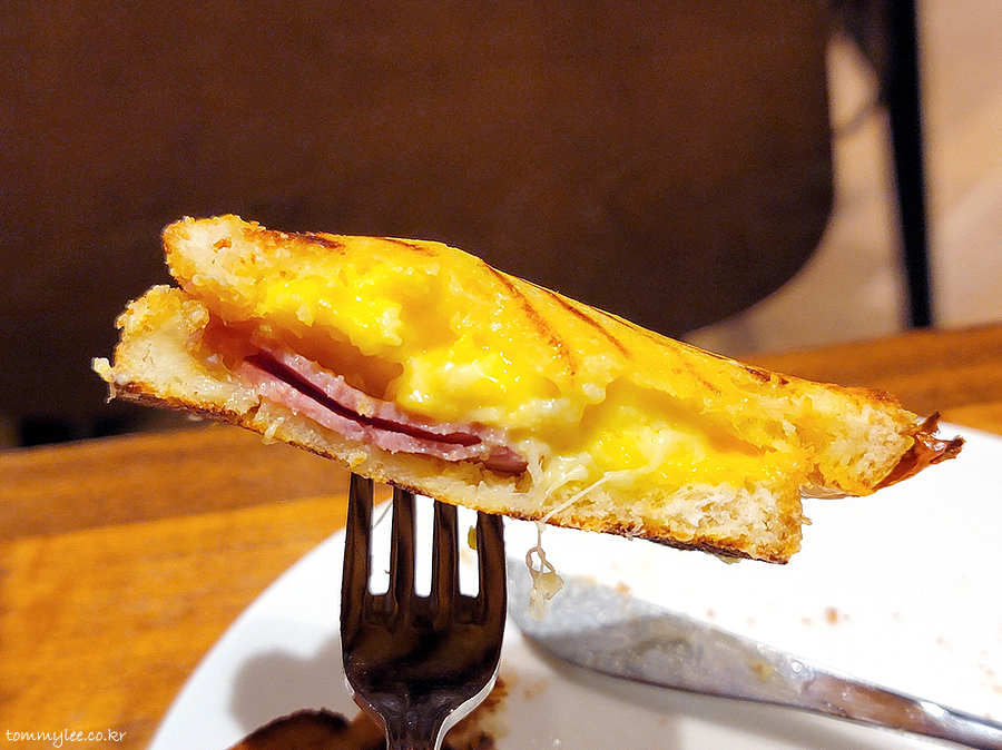 노랗게 지져낸 프렌치토스트 사이에 베이컨과 트리플치즈, 스크램블에그가 샌드 된 프렌치토스트형 핫 샌드위치가 되겠다는..
