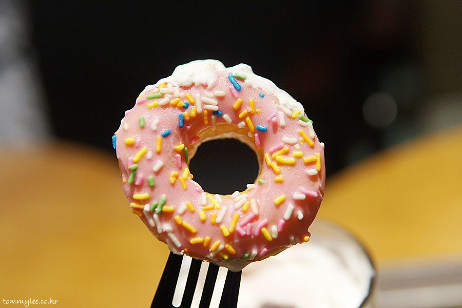 오색 스프링클이 뿌려진 스트로베리 아이싱의 링도넛이랍니다.. 생각보다 먹을만하네요.. 맛없지 않았음..