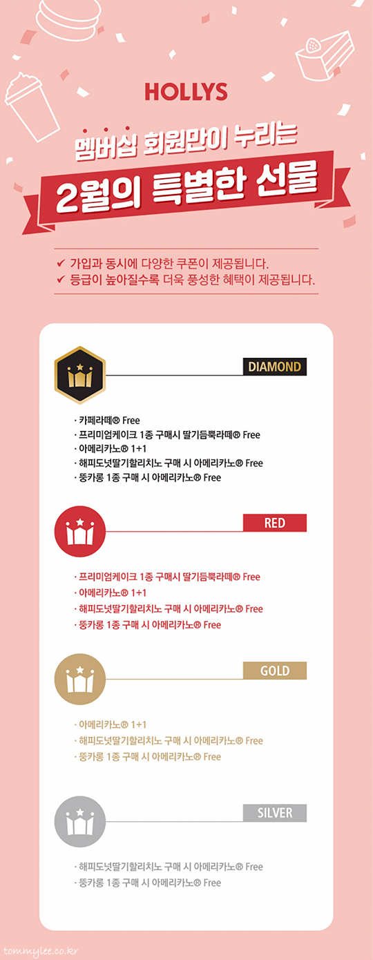 할리스 멤버십 회원만이 누리는 2월의 특별한 선물.. 가입만 하더라도 해피도넛딸기할리치노 구매 시 아메리카노 무료, 뚱카롱 1종 구매 시 아메리카노 무료쿠폰을 받을 수 있답니다..