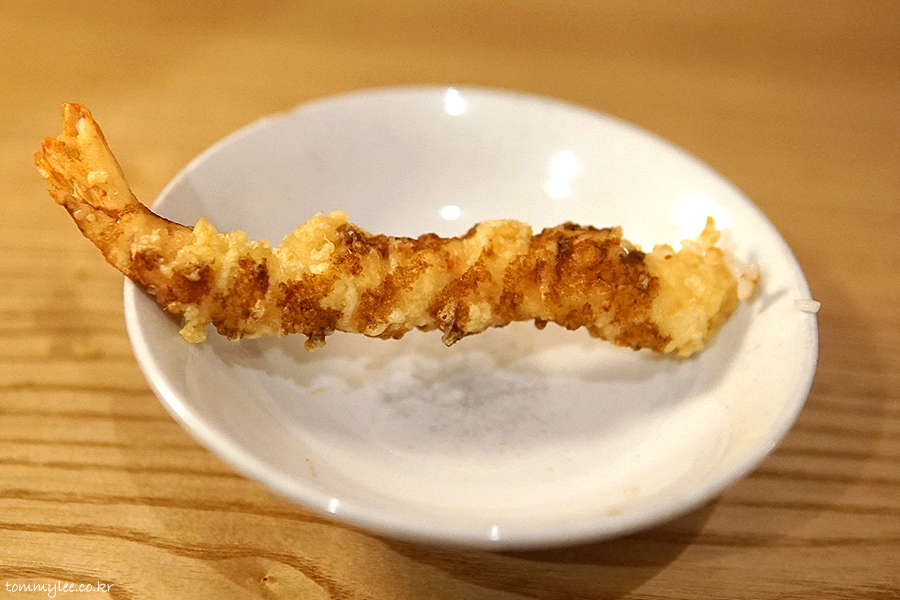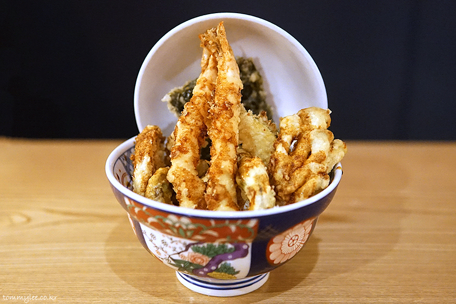 새우에 밥알 하나가 붙어 있어서 이게 눈에 확 띄었네요.. ㅋㅋㅋ.. 튀김을 따로 먹으면 편할 텐데 왜 굳이 밥 위에 산처럼 올려 먹어야 하는 건지 저는 의미를 모르겠어서 텐동을 주문하는 것보다는 텐푸라가 따로 나오는 텐정식을 선호합니다만 이 집은 정식메뉴는 없고 텐동만 판매해 선택권은 없습니다..