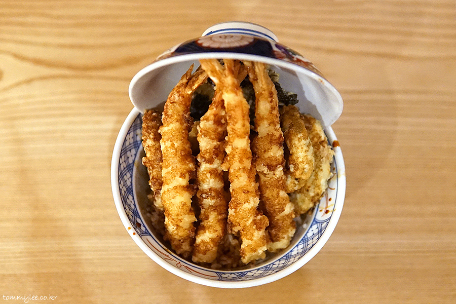 이렇게 뚜껑 받쳐서 나오면 새우가 세울 수 있을 만큼 크다는 거니까 고급 텐동인 것입니다..