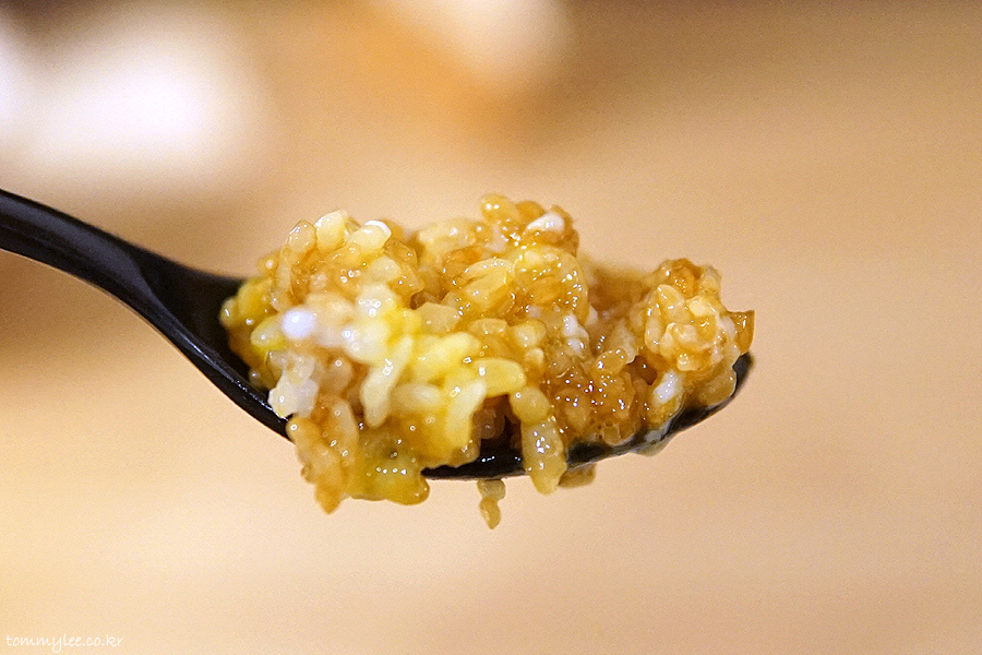 화려한 튀김에 가려 아예 보이질 않지만 밥을 끌어올려봤습니다.. 텐동은 튀김 덮밥(!).. 밥도 중간중간 먹어 줘야 해요.. 타레가 뿌려진 양념밥을 냠냠..