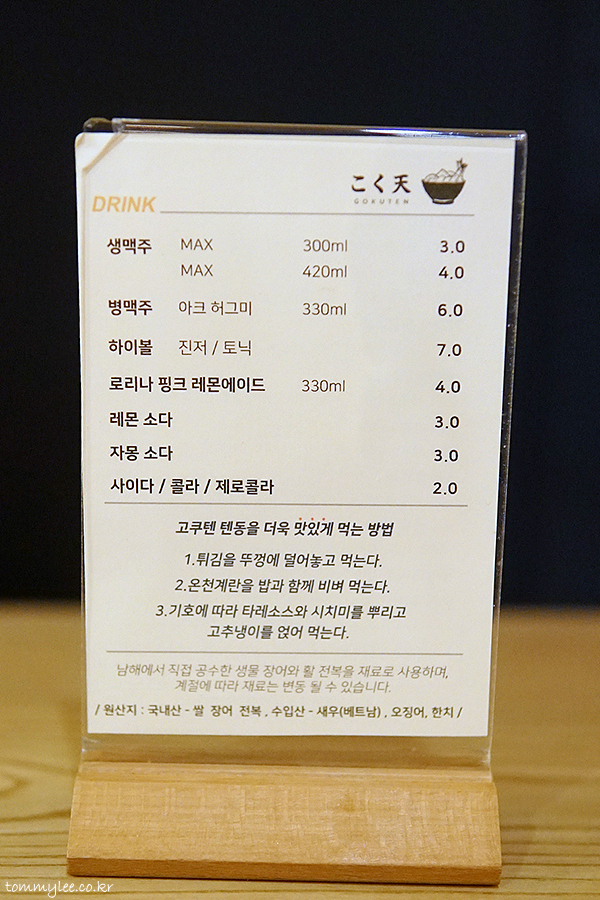 마지막으로 지인분께서 강하게 불만을 가지셨던 점이.. 고쿠텐은 오픈키친인데 주방과 홀의 구분이 없는 한 덩어리인데 환기가 전혀 안되어서 튀김유 특유의 기름 냄새와 열기로 매장 안이 가득했다는 것.. 텐동 먹는 짧은 시간 동안 기름내가 온몸에 배었다면서.. ㅠ.ㅠ.. 어쨌거나 기다림을 감수하면서 먹어야 할 맛도 아니고 멀리서 일부러 찾아와서 먹을만한 맛은 더더욱 아닌 걸로 결론을 내리게 되어 안타깝네요..