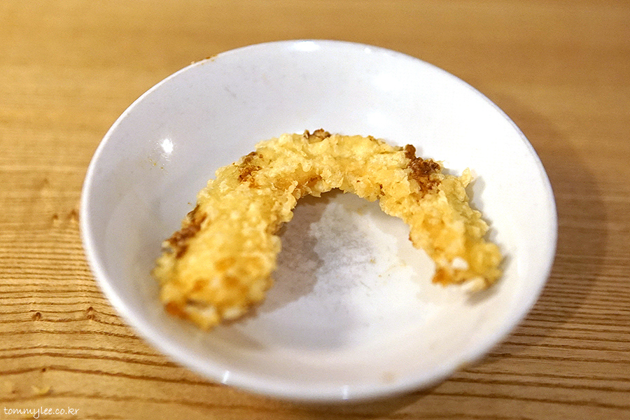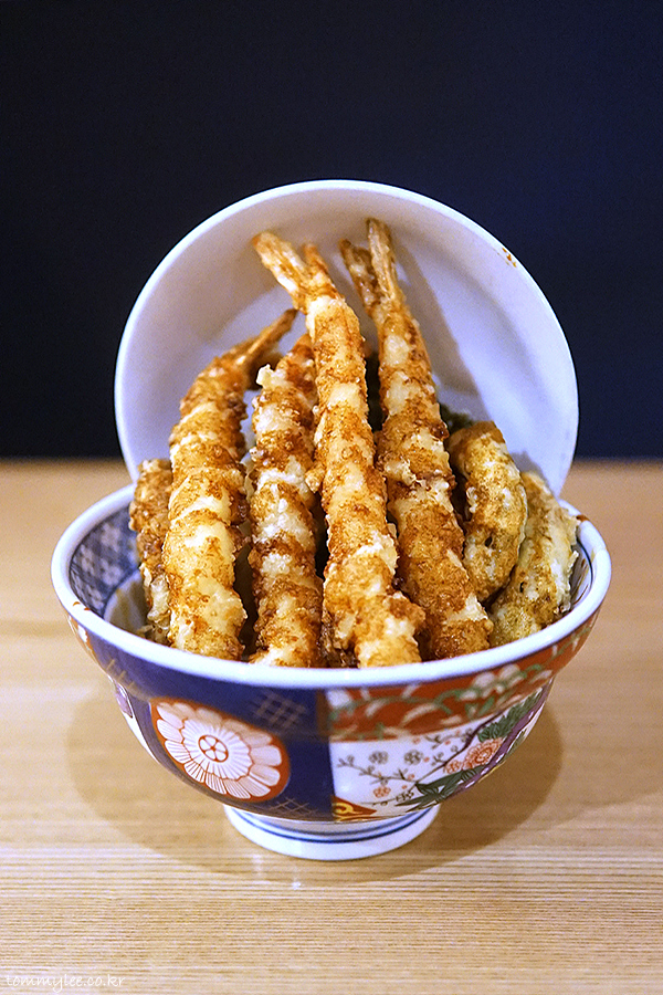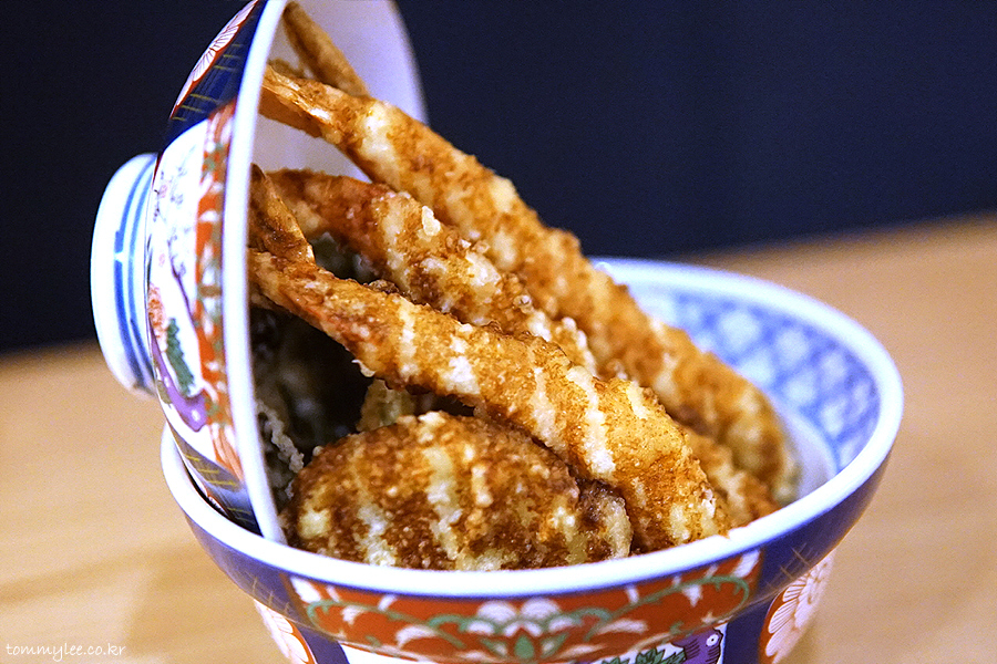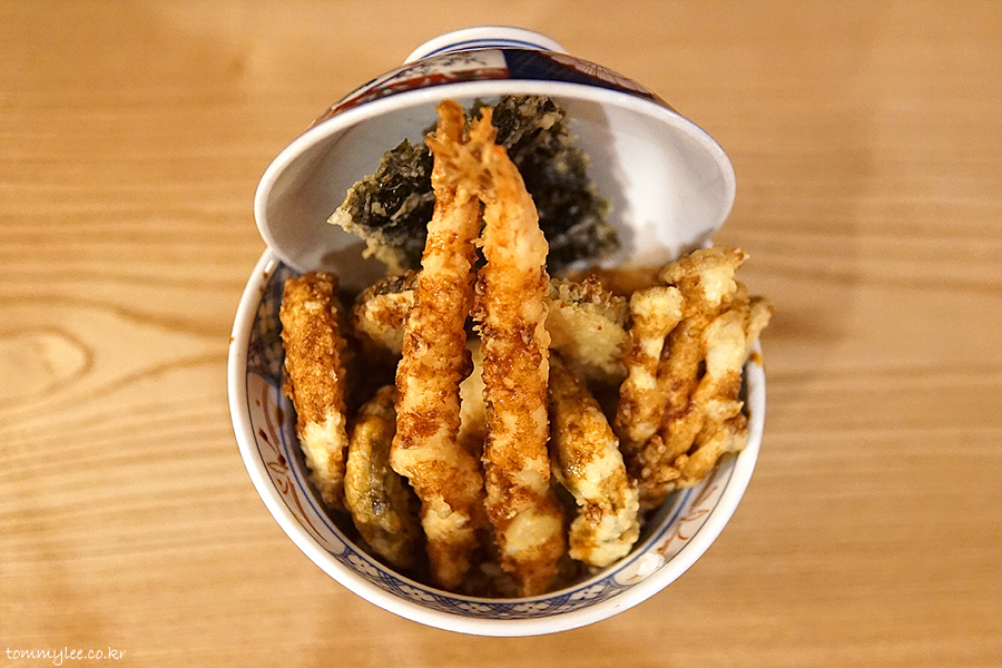 새우에 밥알 하나가 붙어 있어서 이게 눈에 확 띄었네요.. ㅋㅋㅋ.. 튀김을 따로 먹으면 편할 텐데 왜 굳이 밥 위에 산처럼 올려 먹어야 하는 건지 저는 의미를 모르겠어서 텐동을 주문하는 것보다는 텐푸라가 따로 나오는 텐정식을 선호합니다만 이 집은 정식메뉴는 없고 텐동만 판매해 선택권은 없습니다..