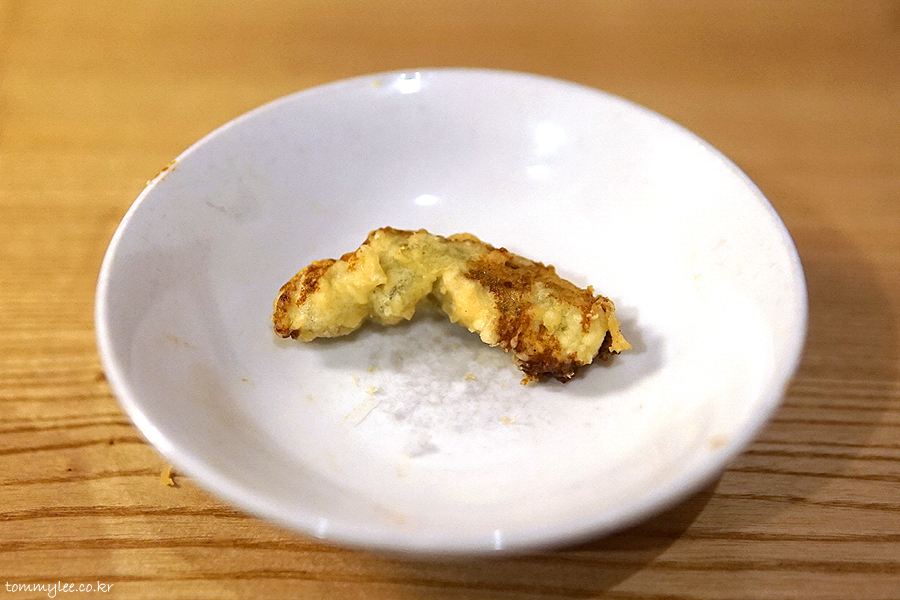 꽈리고추튀김2.. 실수인지 원래 2개인지는 모르겠으나 고추튀김은 2개가 들어 있었어요.. 근데 2개째 먹으니 혀가 얼얼.. 이런 강한 매운맛이라니.. 시시토텐 무섭..