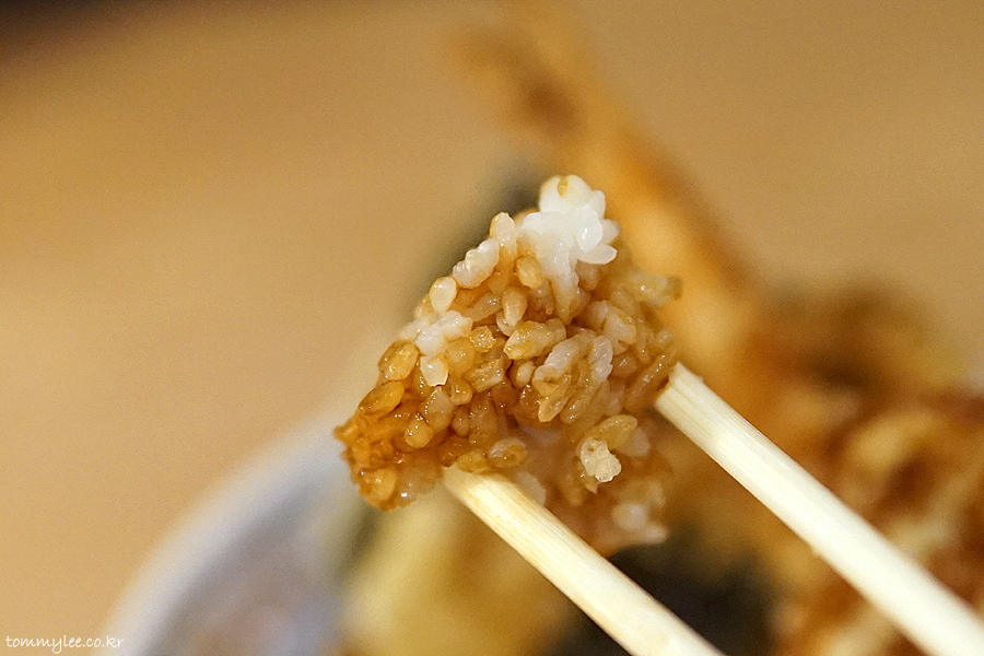 화려한 튀김에 가려 아예 보이질 않지만 밥을 끌어올려봤습니다.. 텐동은 튀김 덮밥(!).. 밥도 중간중간 먹어 줘야 해요.. 타레가 뿌려진 양념밥을 냠냠..