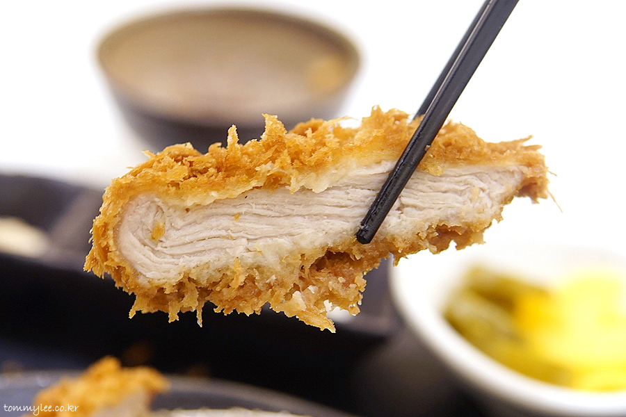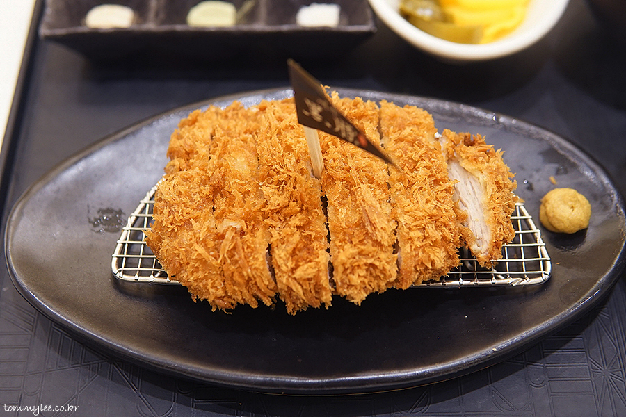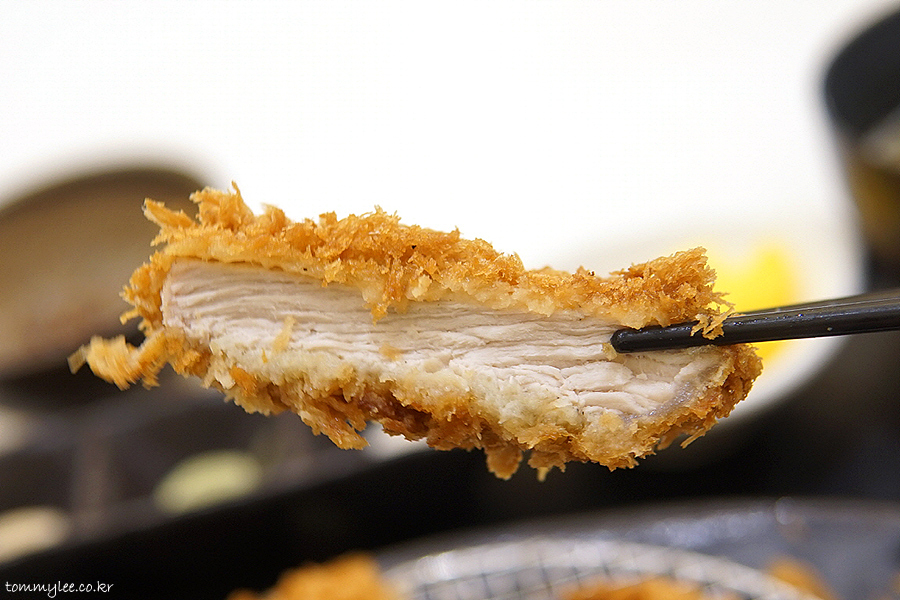 굵은 빵가루옷을 제대로 입혀 튀겨낸 제주흑돈카츠의 모습입니다.. 색이 예쁘게 잘 나왔네요.. 제주흑돈카츠 중량은 150g으로 기본 사보텐 오리지널카츠보다는 20g 더 볼륨이 있답니다..