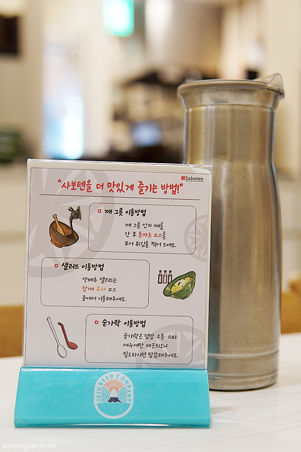 사보텐을 더 맛있게 즐기는 방법으로.. 깨그릇 이용방법과 샐러드 이용방법, 숟가락 이용방법이 친절하게 설명되고 있는 모습입니다.. ㅡㅡ;;..