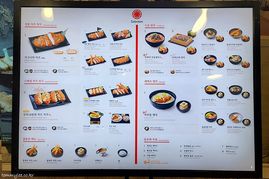 사보텐 메뉴판.. 정통카츠정식, 스페셜카츠정식, 누들정식, 라이스정식, 곁들임메뉴 순이네요..