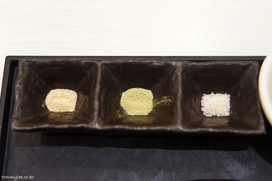 위에서 바라보면 이런 느낌.. 사보텐 톤카츠는 기본적으로 갈은깨 + 돈카츠소스 조합으로 먹는데요.. 이 제주흑돈카츠는 프리미엄 메뉴라서 3가지 소금이 함께 제공된답니다.. 텐푸라처럼 여러가지맛의 소금에 찍어 먹을 수 있는 컨셉..