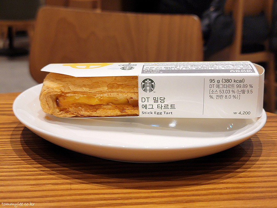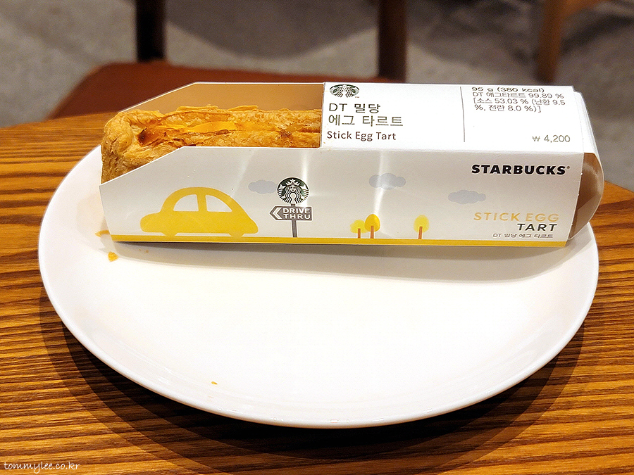 스타벅스 드라이브스루 매장에서만 판매한다는 DT점 한정메뉴 밀당 에그타르트.. 길쭉하고 네모진 모양의 독특한 모습.. 사이즈도 일반적인 에그타르트에 비해 크답니다..