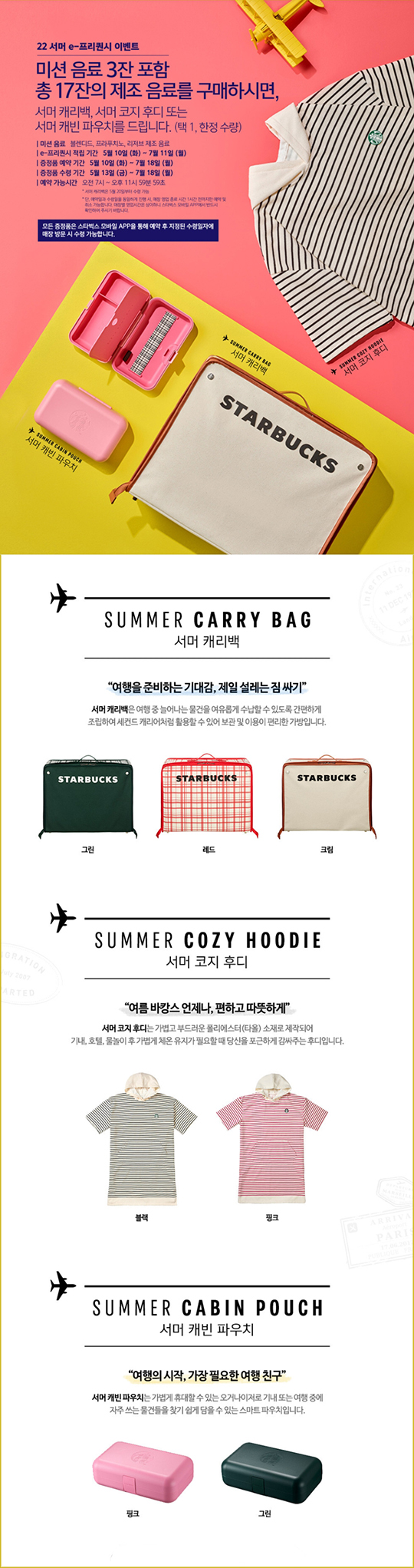 스타벅스 2022 서머 E-프리퀀시 이벤트.. 미션 음료 3잔 포함 총 17잔의 제조 음료를 구매하면 서머 캐리백, 서머 코치 후디 또는 서머 캐빈 파우치를 받을 수 있다는 내용.. 후디는 타올 소재에 사이즈 문제도 있고 하니 저와는 상관없는 아이템인 것 같고.. 캐리백이나 캐빈파우치를 받아야 할 듯한데.. 2020 서머레디백 때 밤샘 오픈런 사태에 전 질려 버려서.. ㅋㅋㅋ..