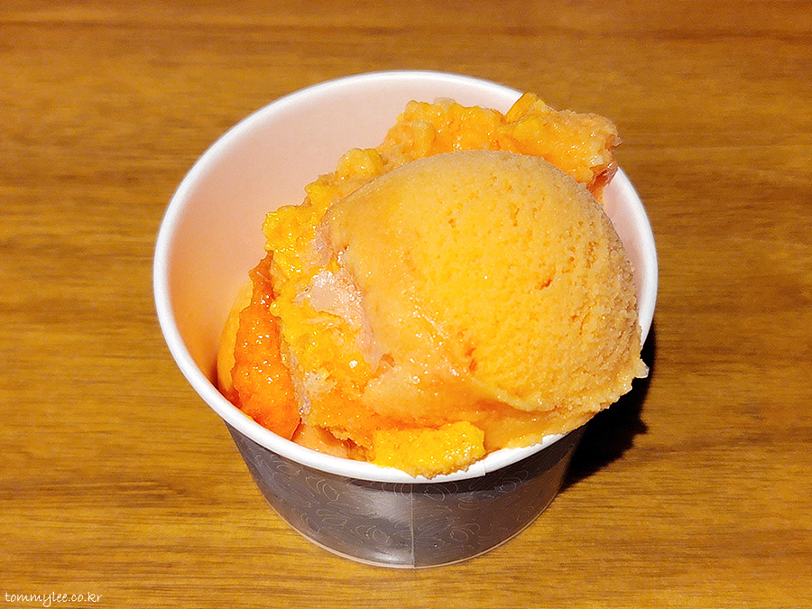 파스쿠찌 젤라또컵 기프티콘으로 주문한 강력한 오렌지색의 멜론 젤라토.. 파스쿠찌 젤라또는 기본 2스쿱.. 스쿱 당 2천원인 셈.. 요즘 배스킨라빈스 싱글킹 가격이 4천원임을 감안하면 저렴하다고 생각되네요..