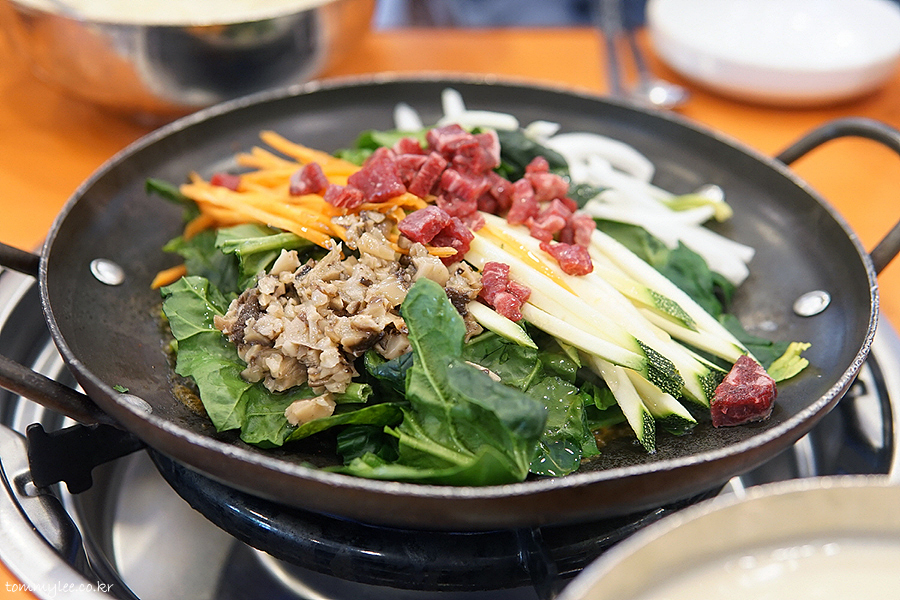 진주회관 김치볶음밥은 주재료인 김치 외에 표고버섯과 쇠고기가 들어가는 밸류 높은 고오급 김치볶음밥을 표방하고 있답니다.. 여기 시금치, 양파, 당근채, 호박채까지 들어가서 시각적인 즐거움까지 선사하는 메뉴.. 예뻐서 볶기 아깝다고 막.. ㅋㅋㅋ..