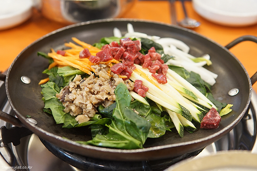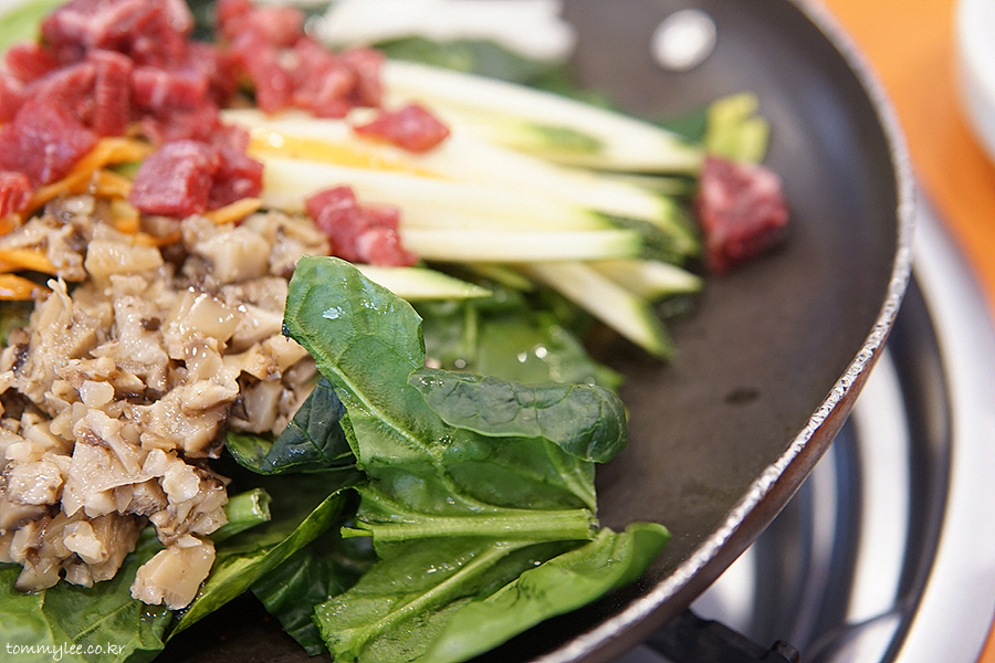 진주회관 김치볶음밥은 주재료인 김치 외에 표고버섯과 쇠고기가 들어가는 밸류 높은 고오급 김치볶음밥을 표방하고 있답니다.. 여기 시금치, 양파, 당근채, 호박채까지 들어가서 시각적인 즐거움까지 선사하는 메뉴.. 예뻐서 볶기 아깝다고 막.. ㅋㅋㅋ..