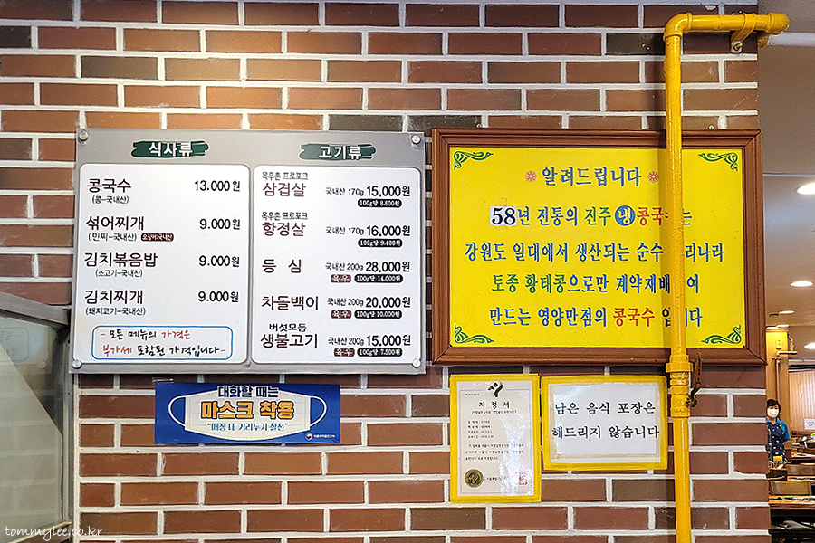 진주회관 메뉴 및 가격.. 콩국수 13,000원, 섞어찌개 9,000원, 김치볶음밥 9,000원, 김치찌개 9,000원 / 삼겹살 15,000원, 항정살 16,000원, 등심 28,000원, 차돌백이 20,000원, 생불고기 15,000원.. 물가가 많이 올라서 콩국수 14,000원 예상했으나 작년 후기와 비교해보니 가격인상 없네요.. 가격동결 고마워요 진주회관.. ㅠ.ㅠ..
