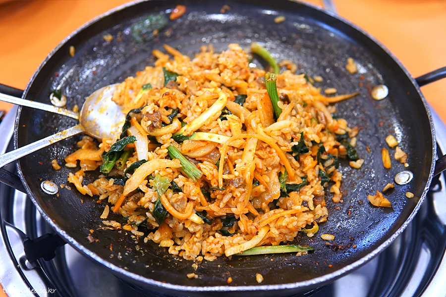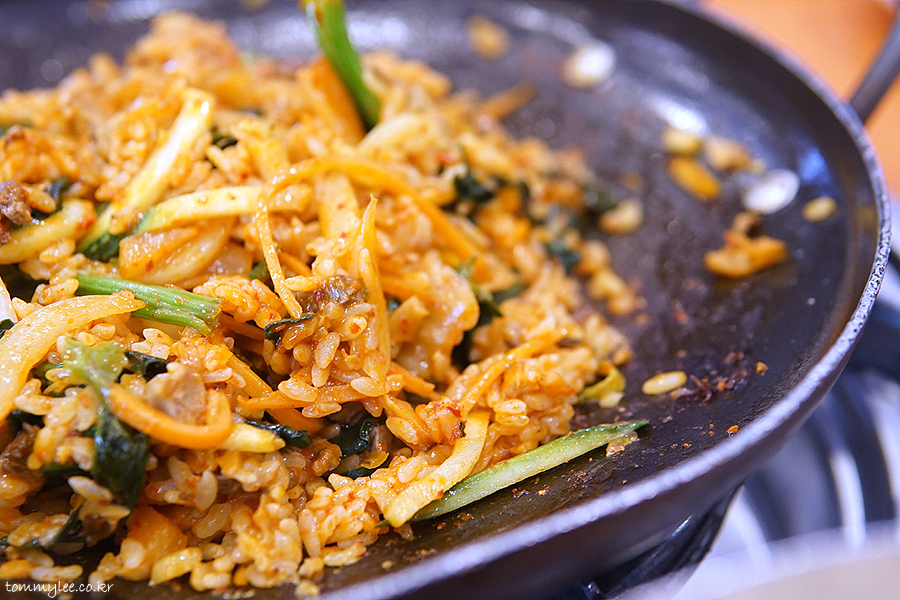 따로 나오는 공기밥을 투하해 볶아볶아 하는 즉석 김치볶음밥.. 직접 볶아 먹는 건 아니고 직원분께서 다 알아서 볶아주시니 나중에 결과물을 먹기만 하면 됩니다..