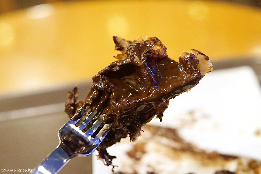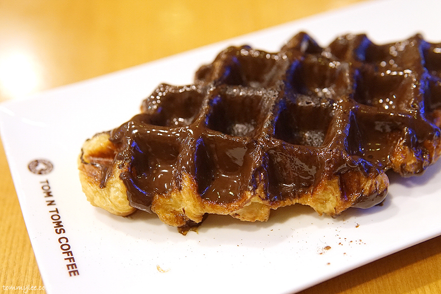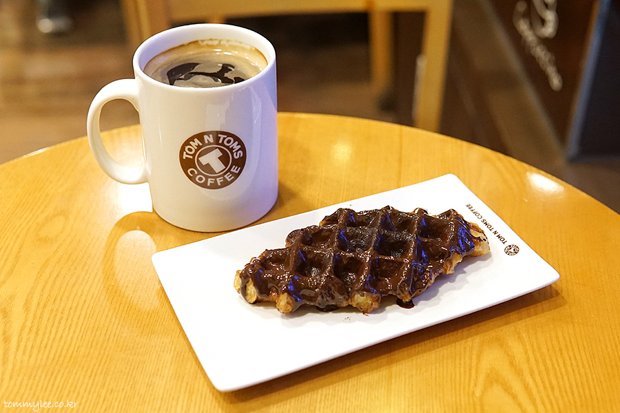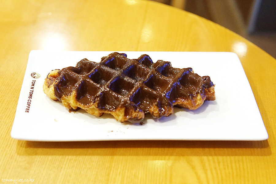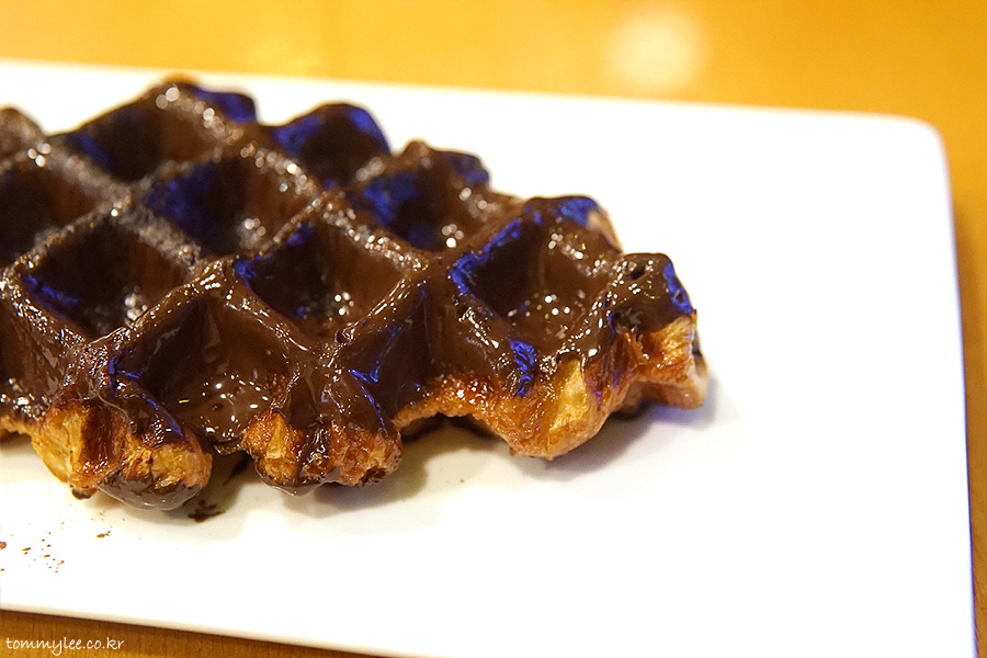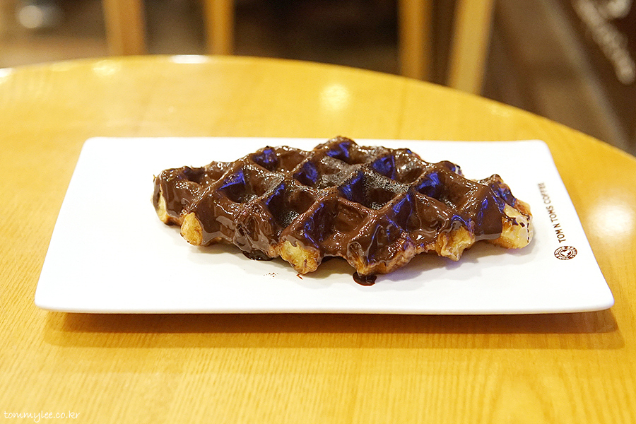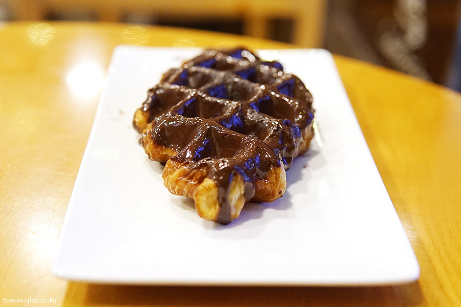 갓 구워낸 크로플에 다크 초콜릿을 코팅하고 코코아 파우더를 솔솔.. 탐앤탐스 다크초코 크로플..