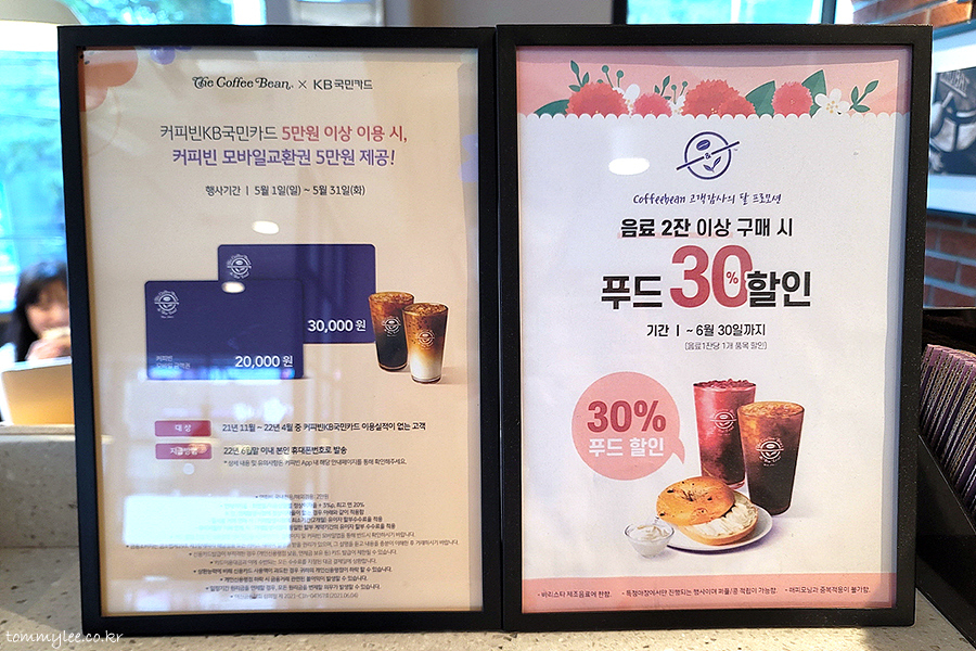 커피빈 고객감사의 달 프로모션.. 음료 2잔 이상 구매 시 푸드 30% 할인.. 6월 말까지 진행이고 음료 1잔당 1개 품목 할인이네요.. 혼자 음료 2잔 마실 수도 없고 해서 저에겐 해당사항이 없는 행사였네요.. ㅠ.ㅠ..