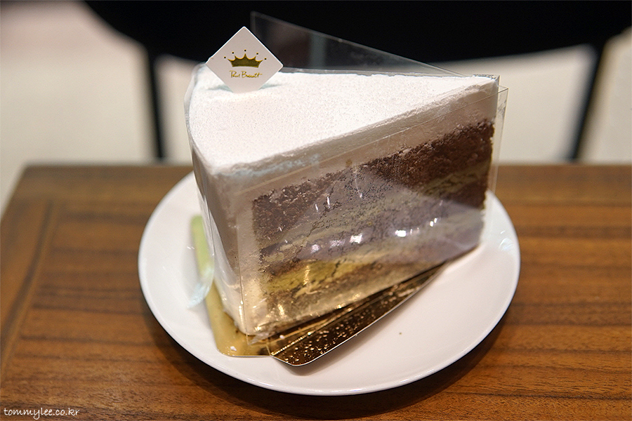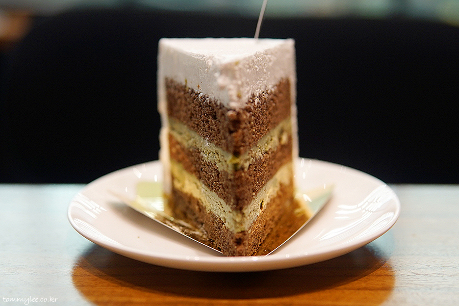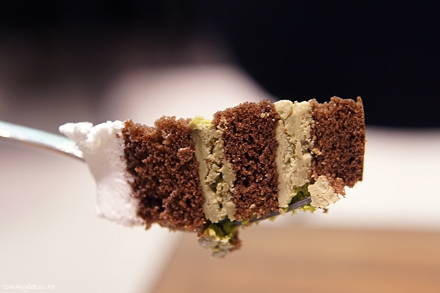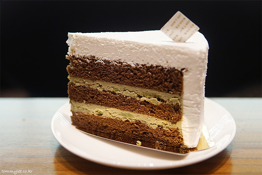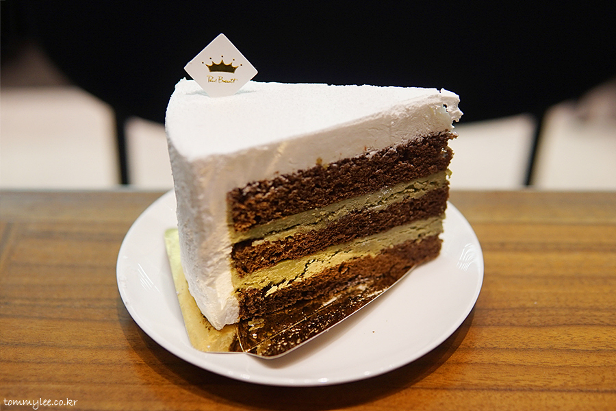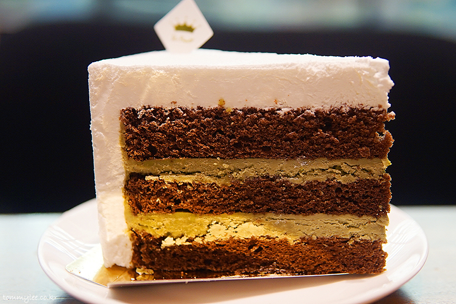 초콜릿 케이크 시트 사이사이에 녹차 가나슈를 샌드하고 우유크림으로 커버해 마무리..