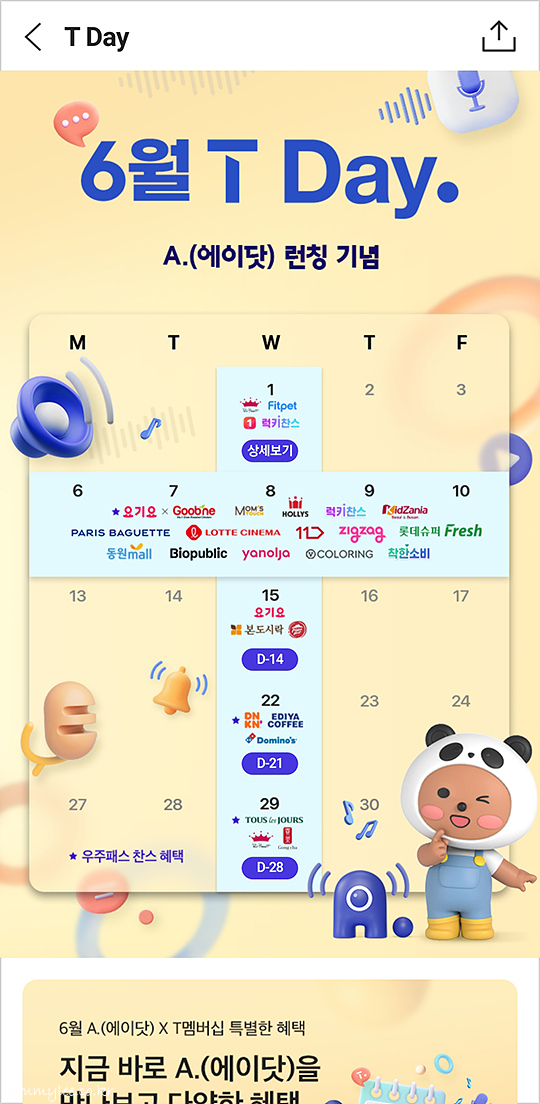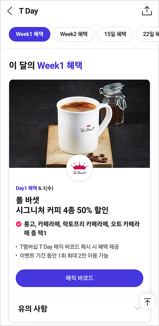 T멤버십 6월 T데이.. 6월은 첫째 주와 넷째 주 수요일에 폴바셋에서 T멤버십 매직바코드를 제시하면 시그니처커피 50%할인 혜택을 받을 수 있답니다..