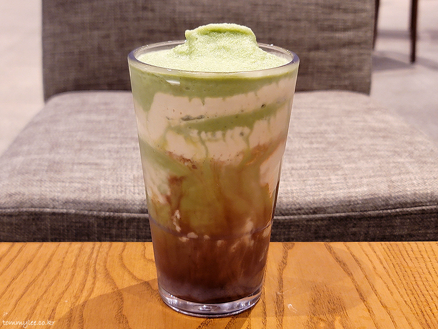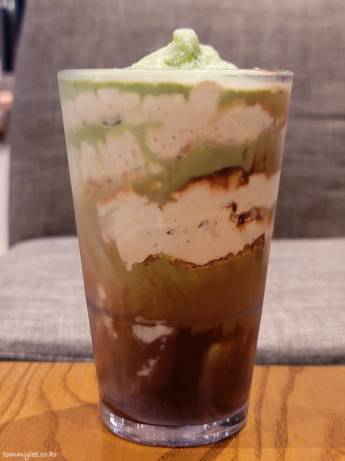 잘 어울리지 않을 것 같은 말차와 커피를 어떻게 합쳐냈을지 궁금했던 음료.. 말차 프라푸치노에 콜드브루 모카소스 조합이라고 합니다..