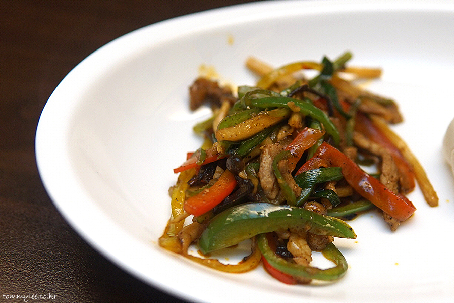 상하이문 고추잡채 그러고 보니 처음이네요.. 고운 때깔의 홍피망과 청피망이 글로시하게 마무리되어 있네요..