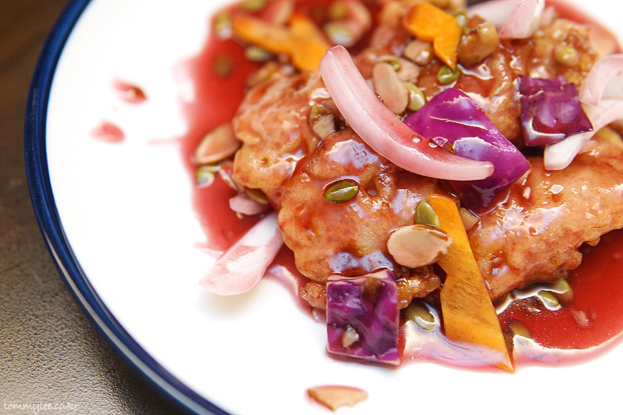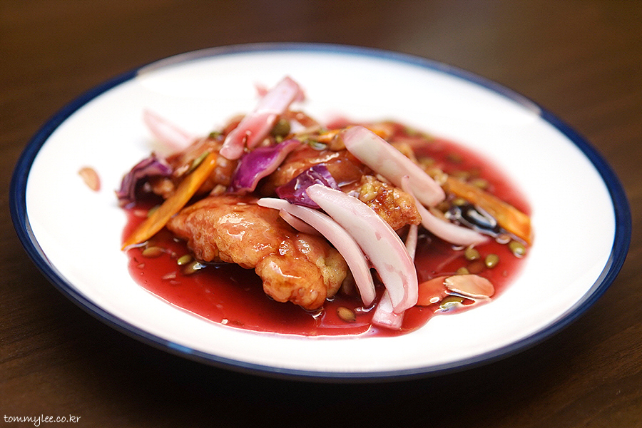 원래 꿔바로우는 이런 색이 아니었는데 오늘은 평소보다 더 예쁘게 나와서 기분이 좋은.. 상하이문은 사실 같은 메뉴를 주문하면 다른 중식당들처럼 매번 복사해서 붙여넣기한 듯한 똑같은 복붙 메뉴가 나오는 것이 아니라 어렌지를 꽤 빈번하게 하는 편입니다.. 그래서 지겹지가 않고 새로워요.. 이런 부분을 저는 높게 평가합니다..